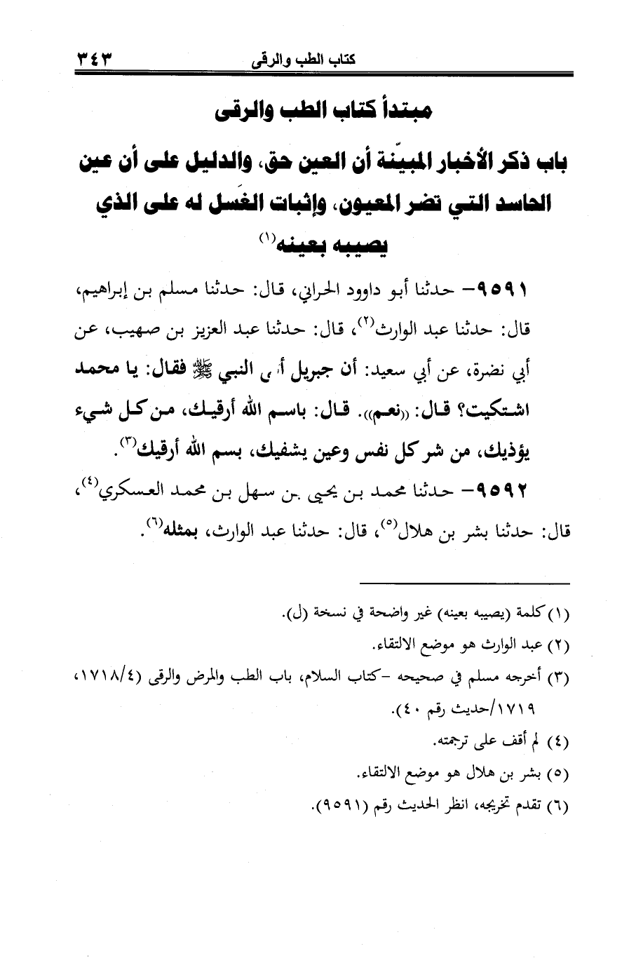 9591 - حدثنا أبو داوود الحراني، قال: حدثنا مسلم بن إبراهيم، قال: حدثنا عبد الوارث (¬1)، قال: حدثنا عبد العزيز بن صهيب، عن أبي نضرة، عن أبي سعيد: أن جبريل أتى النبي -صلى الله عليه وسلم- فقال: يا محمَّد اشتكيت؟ قال: "نعم". قال: باسم الله أرقيك، من كل شيء يؤذيك، من شر كل نفس وعين يشفيك، بسم الله أرقيك (¬2).