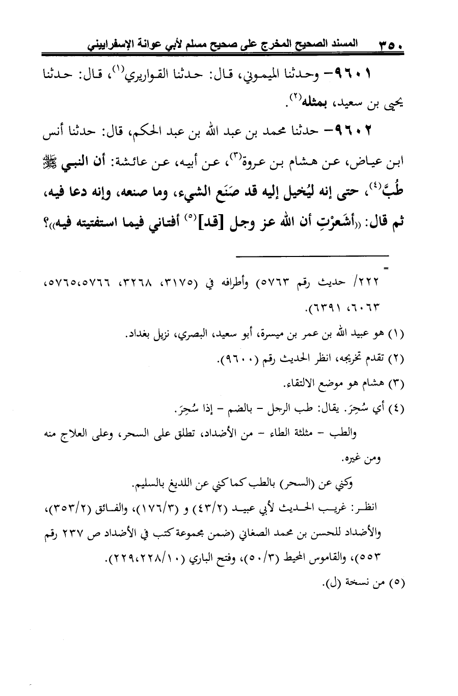 9602 - حدثنا محمَّد بن عبد الله بن عبد الحكم، قال: حدثنا أنس ابن عياض، عن هشام بن عروة (¬1)، عن أبيه، عن عائشة: أن النبي -صلى الله عليه وسلم- طُبَّ (¬2)، حتى إنه ليُخيل إليه قد صَنَع الشيء، وما صنعه، وإنه دعا فيه، ثم قال: "أشَعرْتِ أن الله عَزَّ وَجَلَّ [قد] (¬3) أفتاني فيما استفتيته فيه"؟
