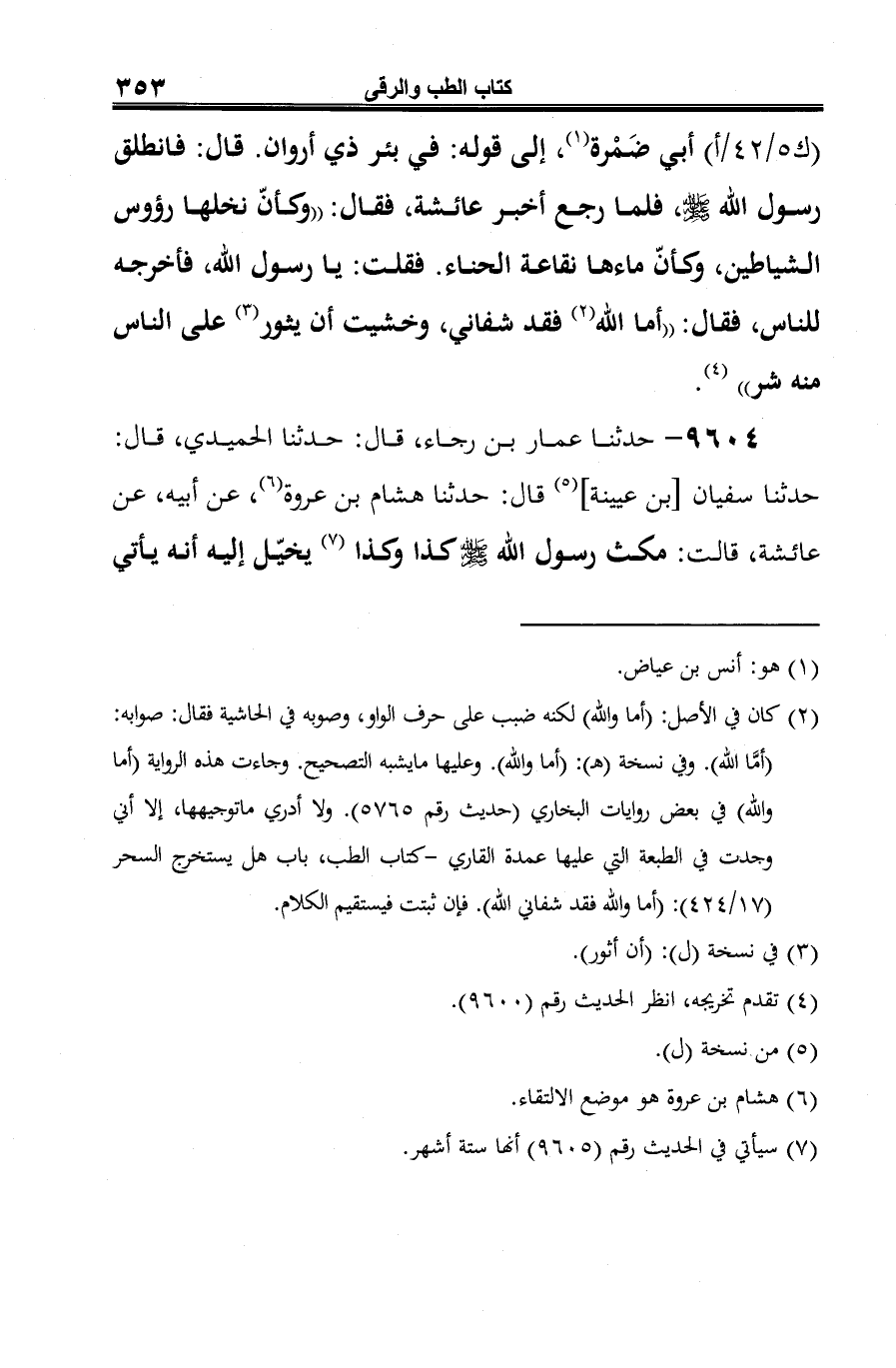 9604 - حدثنا عمار بن رجاء، قال: حدثنا الحميدي، قال: حدثنا سفيان [بن عيينة] (¬1) قال: حدثنا هشام بن عروة (¬2)، عن أبيه، عن عائشة، قالت: مكث رسول الله -صلى الله عليه وسلم- كذا وكذا (¬3) يخيّل إليه أنه يأتي