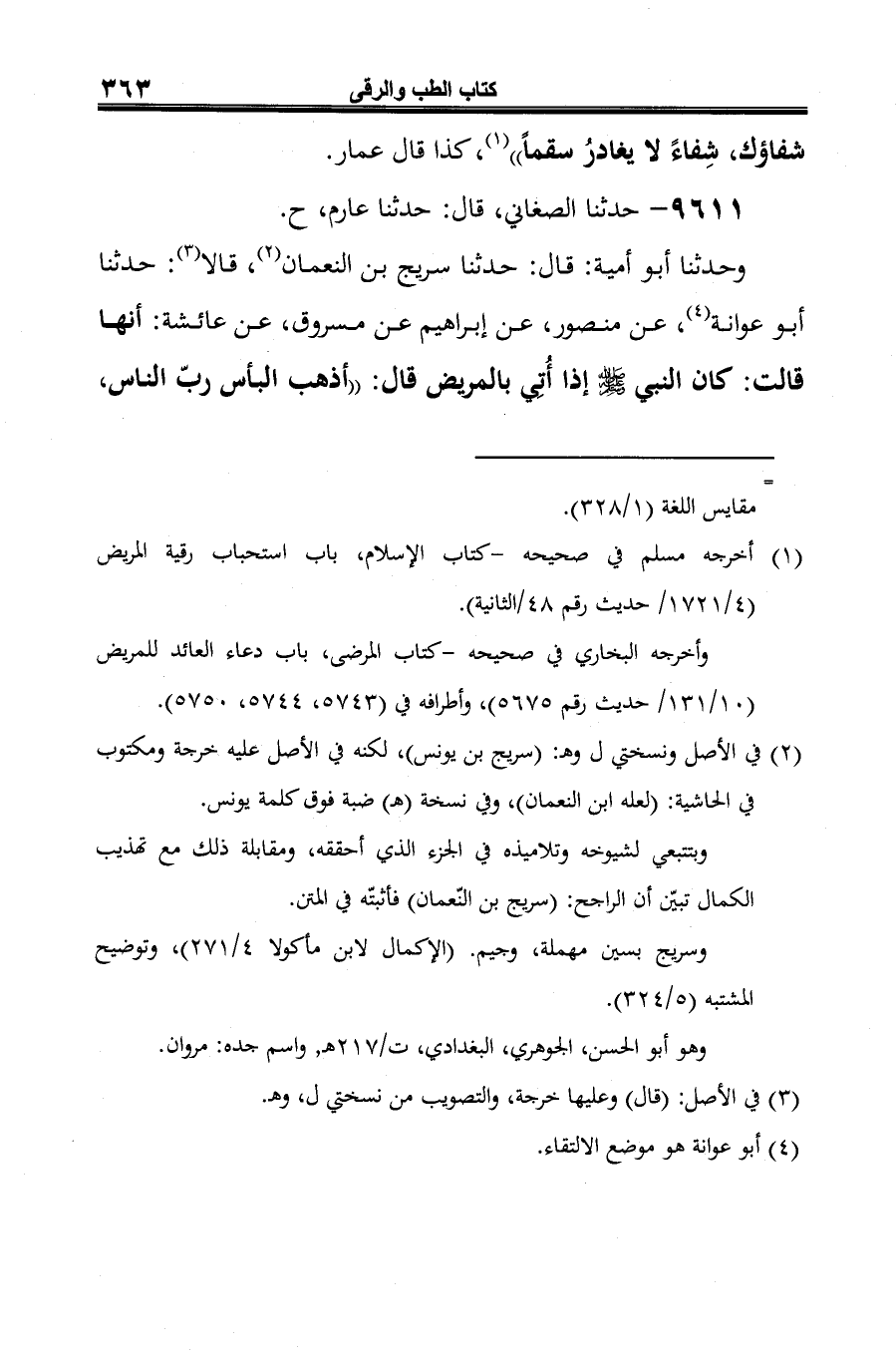وحدثنا أبو أمية: قال: حدثنا سريج بن النعمان (¬1)، قالا (¬2): حدثنا أبو عوانة (¬3)، عن منصور، عن إبراهيم عن مسروق، عن عائشة: أنها قالت: كان النبي -صلى الله عليه وسلم- إذا أُتِي بالمريض قال: "أذهب البأس ربّ الناس،