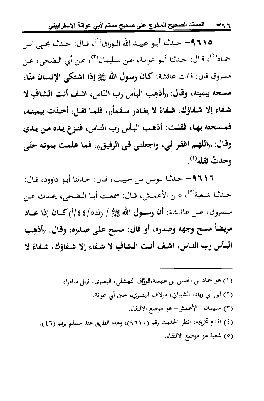 9615 - حدثنا أَبو عبيد الله الوراق (¬1)، قال: حدثنا يحيى ابن حماد (¬2)، قال: حدثنا أَبو عوانة، عن سليمان (¬3)، عن أبي الضحى، عن مسروق قال: قالت عائشة: كان رسول الله -صلى الله عليه وسلم- إذا اشتكى الإنسان منّا، مسحه بيمينه، وقال: "أذهِب البأس رب النّاس، اشف أنت الشافِ لا شفاء إلا شفاؤك، شفاءً لا يغادر سقمًا"، فلما ثقل، أخذت بيمينه، فمسحته بها، فقلت: أذهب الباس رب الناس، فنزع يده من يدي وقال: "اللهم اغفر لي، واجعلني في الرفيق"، فما علمت بموته حتّى وجدتُ ثقله (¬4).