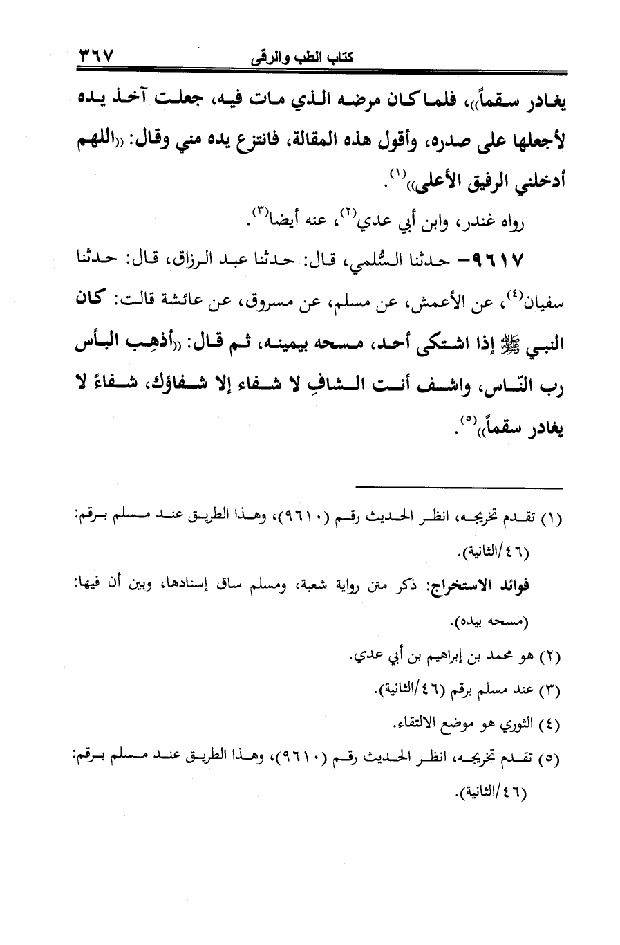 9617 - حدثنا السُّلمي، قال: حدثنا عبد الرزاق، قال: حدثنا سفيان (¬1)، عن الأعمش، عن مسلم، عن مسروق، عن عائشة قالت: كان النبي -صلى الله عليه وسلم- إذا اشتكى أحد، مسحه بيمينه، ثم قال: "أذهِب البأس رب النّاس، واشف أنت الشافِ لا شفاء إلا شفاؤك، شفاءً لا يغادر سقمًا" (¬2).