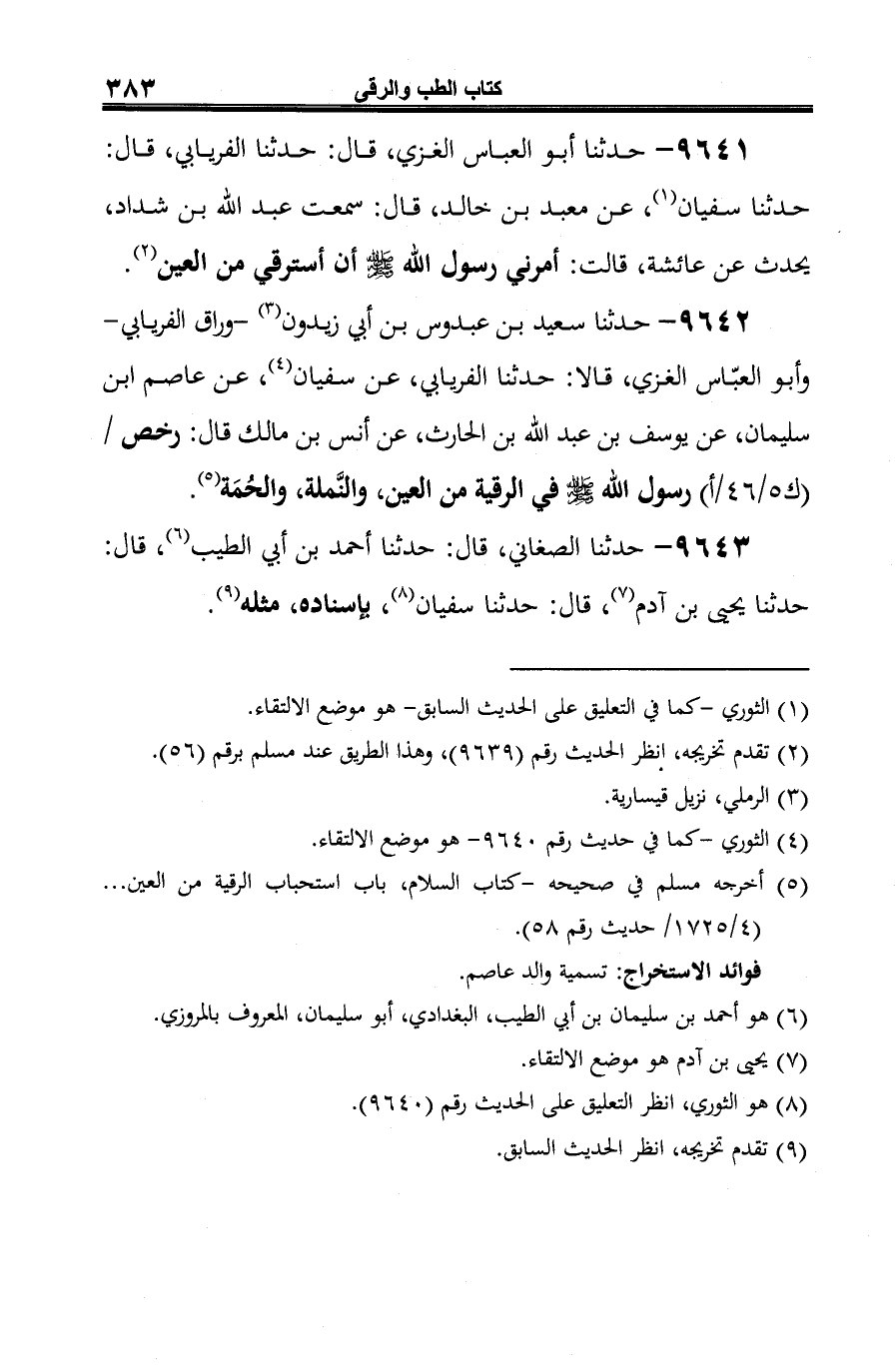 9642 - حدثنا سعيد بن عبدوس بن أبي زيدون (¬1) -وراق الفريابي- وأبو العبّاس الغزي، قالا: حدثنا الفريابي، عن سفيان (¬2)، عن عاصم ابن سليمان، عن يوسف بن عبد الله بن الحارث، عن أنس بن مالك قال: رخص رسول الله -صلى الله عليه وسلم- في الرقية من العين، والنَّملة، والحُمَة (¬3).