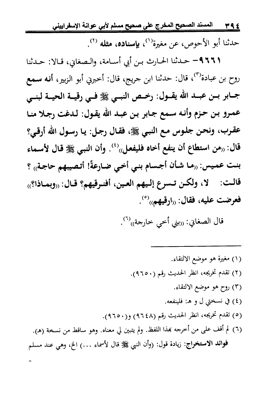 (¬5) زيادة من نسختي (ل)، (هـ)، إلا أن عليه في نسخة (هـ) علامة (لا- إلى) وفيها ذكر طرف الحديث وهو: (عن جابر أن رجلا قال: أفي العقرب رقية؟ فقال رسول الله -صلى الله عليه وسلم-: "من استطاع". وذكر الحديث).