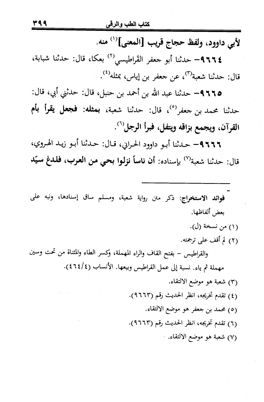 9666 - حدثنا أَبو داوود الحراني، قال: حدثنا أَبو زيد الهروي، قال: حدثنا شعبة (¬1) بإسناده: أن ناسًا نزلوا بحي من العرب، فلدغ سيّد