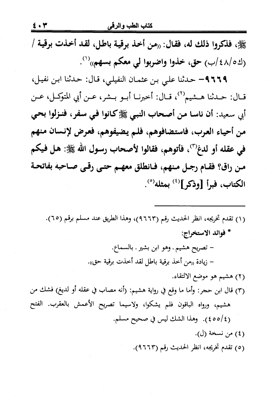 9669 - حدثنا علي بن عثمان النفيلي، قال: حدثنا ابن نفيل، قال: حدثنا هشيم (¬1)، قال: أخبرنا أَبو بشر، عن أبي المتوكل، عن أبي سعيد: أن ناسا من أصحاب النبي -صلى الله عليه وسلم- كانوا في سفر، فنزلوا بحي من أحياء العرب، فاستضافوهم، فلم يضيفوهم، فعرض لإنسان منهم في عقله أو لدغ (¬2)، فأتوهم، فقالوا لأصحاب رسول الله -صلى الله عليه وسلم-: هل فيكم من راق؟ فقام رجل منهم، فانطلق معهم حتى رقى صاحبة بفاتحة الكتاب، فبرأ [وذكر] (¬3) بمثله (¬4).