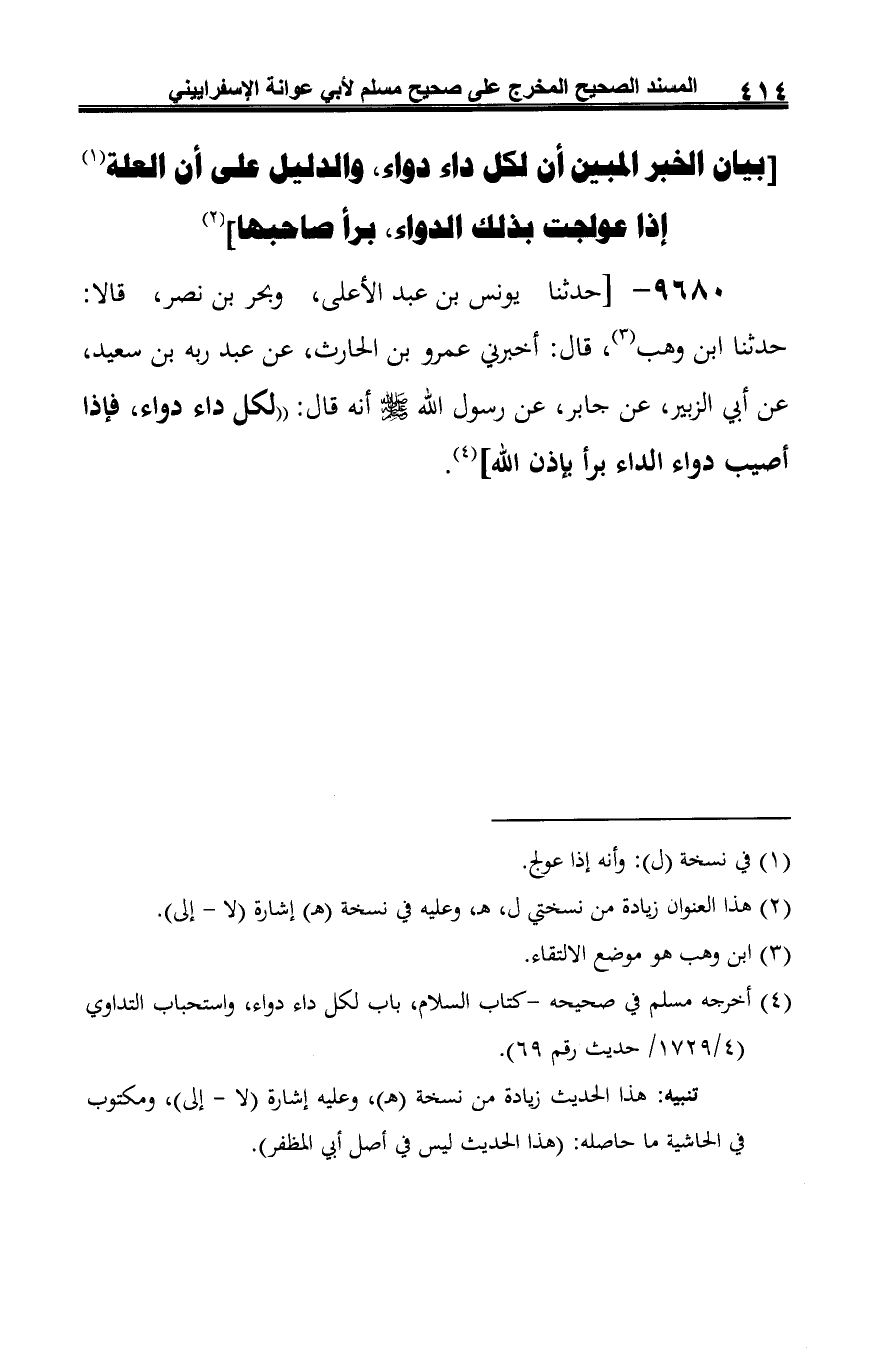 9680 - [حدثنا يونس بن عبد الأعلى، وبحر بن نصر، قالا: حدثنا ابن وهب (¬1)، قال: أخبرني عمرو بن الحارث، عن عبد ربه بن سعيد، عن أبي الزبير، عن جابر، عن رسول الله -صلى الله عليه وسلم- أنه قال: "لكل داء دواء، فإذا أصيب دواء الداء برأ بإذن الله] (¬2).