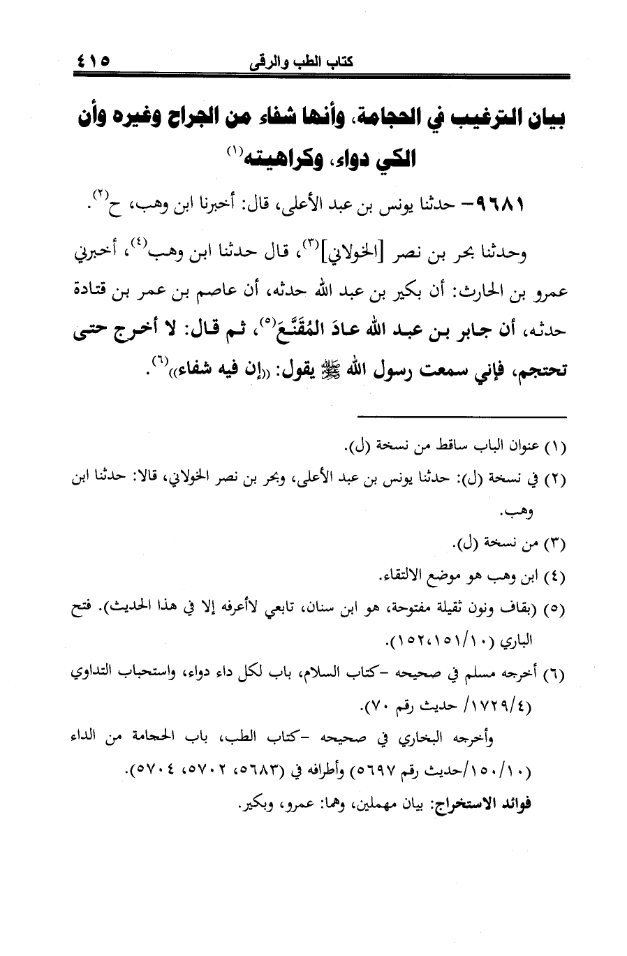 وحدثنا بحر بن نصر [الخولاني] (¬2)، قال حدثنا ابن وهب (¬3)، أخبرني عمرو بن الحارث: أن بكير بن عبد الله حدثه، أن عاصم بن عمر بن قتادة حدثه، أن جابر بن عبد الله عادَ المُقَنَّعَ (¬4)، ثم قال: لا أخرج حتى تحتجم، فإني سمعت رسول الله -صلى الله عليه وسلم- يقول: "إن فيه شفاء" (¬5).