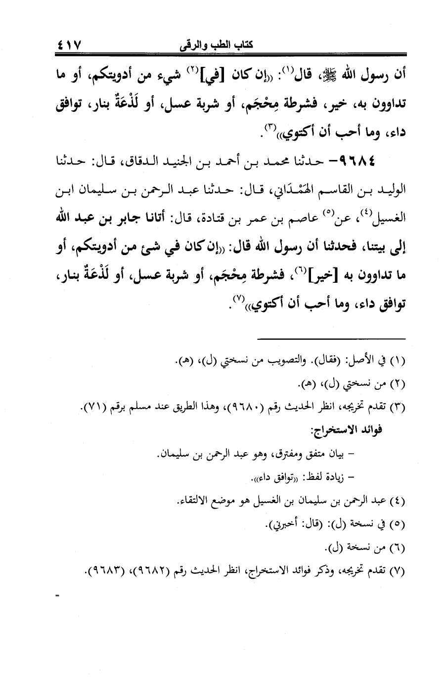 9684 - حدثنا محمد بن أحمد بن الجنيد الدقاق، قال: حدثنا الوليد بن القاسم الهَمْدَاني، قال: حدثنا عبد الرحمن بن سليمان ابن الغسيل (¬1)، عن (¬2) عاصم بن عمر بن قتادة، قال: أتانا جابر بن عبد الله إلى بيتنا، فحدثنا أن رسول الله قال: "إن كان في شيء من أدويتكم، أو ما تداوون به [خير] (¬3)، فشرطة مِحْجَم، أو شربة عسل، أو لَذْعَةٌ بنار، توافق داء، وما أحب أن أكتوي" (¬4).