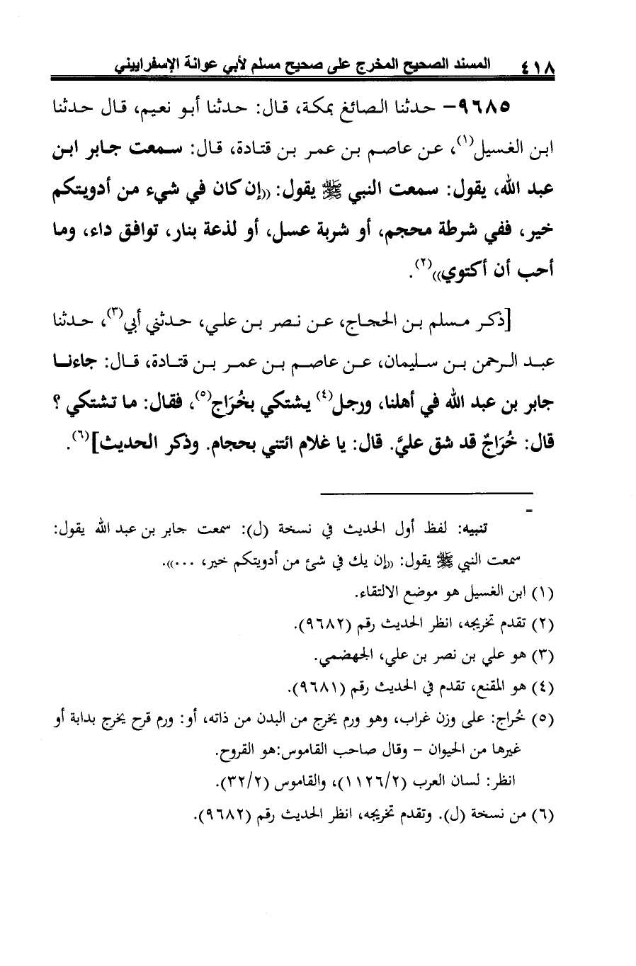 9685 - حدثنا الصائغ بمكة، قال: حدثنا أَبو نعيم، قال حدثنا ابن الغسيل (¬1)، عن عاصم بن عمر بن قتادة، قال: سمعت جابر ابن عبد الله، يقول: سمعت النبي -صلى الله عليه وسلم- يقول: "إن كان في شيء من أدويتكم خير، ففي شرطة محجم، أو شربة عسل، أو لذعة بنار، توافق داء، وما أحب أن أكتوي" (¬2).
