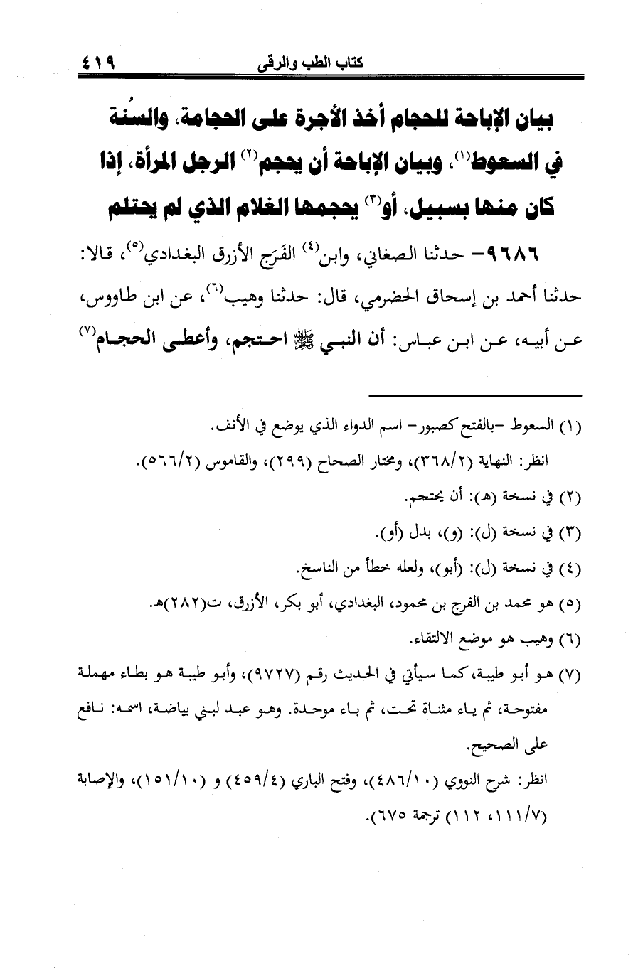 9686 - حدثنا الصغاني، وابن (¬1) الفَرَج الأزرق البغدادي (¬2)، قالا: حدثنا أحمد بن إسحاق الحضرمي، قال: حدثنا وهيب (¬3)، عن ابن طاووس، عن أبيه، عن ابن عباس: أن النبي -صلى الله عليه وسلم- احتجم، وأعطى الحجام (¬4)