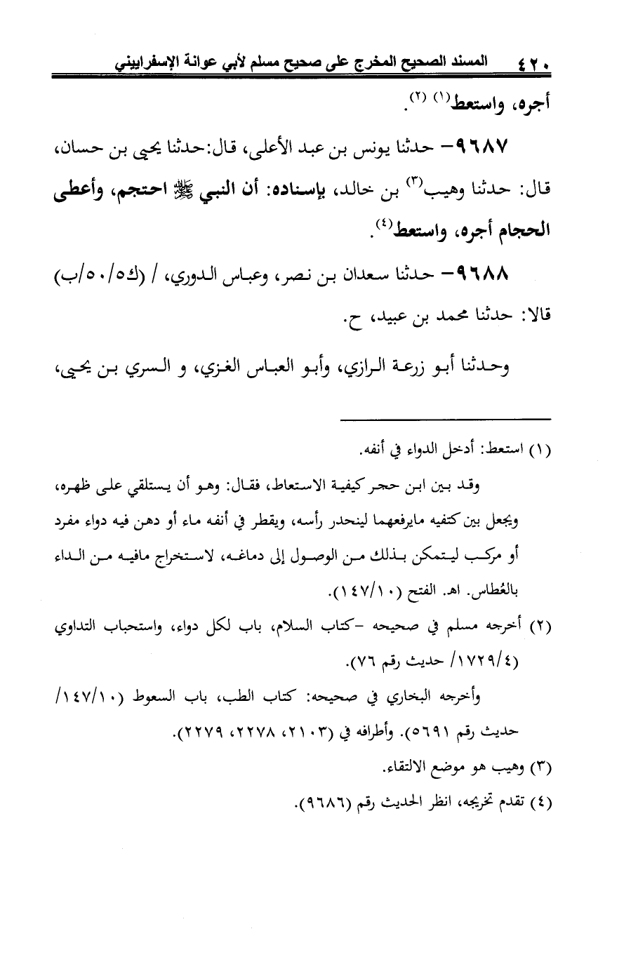 9687 - حدثنا يونس بن عبد الأعلى، قال: حدثنا يحيى بن حسان، قال: حدثنا وهيب (¬1) بن خالد، بإسناده: أن النبي -صلى الله عليه وسلم- احتجم، وأعطى الحجام أجره، واستعط (¬2).