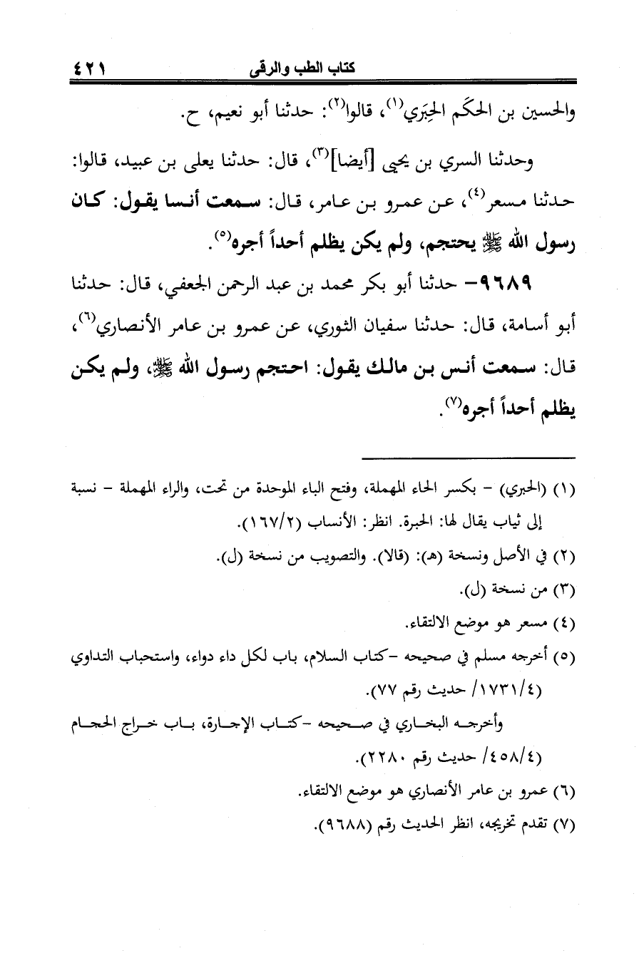 9689 - حدثنا أَبو بكر محمد بن عبد الرحمن الجعفي، قال: حدثنا أَبو أسامة، قال: حدثنا سفيان الثوري، عن عمرو بن عامر الأنصاري (¬1)، قال: سمعت أنس بن مالك يقول: احتجم رسول الله -صلى الله عليه وسلم-، ولم يكن يظلم أحدًا أجره (¬2).