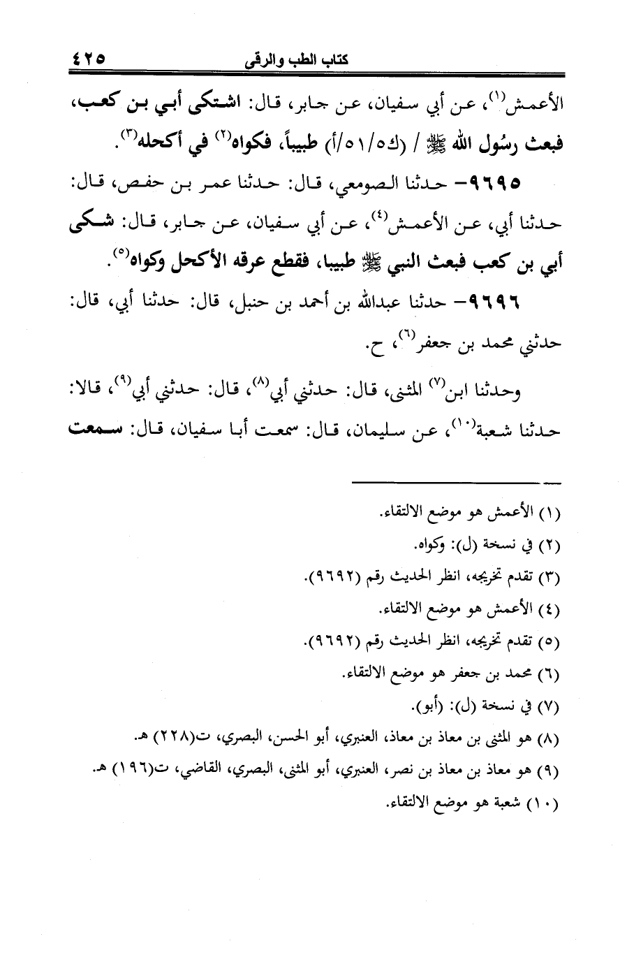 9695 - حدثنا الصومعي، قال: حدثنا عمر بن حفص، قال: حدثنا أبي، عن الأعمش (¬1)، عن أبي سفيان، عن جابر، قال: شكى أبي بن كعب فبعث النبي -صلى الله عليه وسلم- طبيبا، فقطع عرقه الأكحل وكواه (¬2).