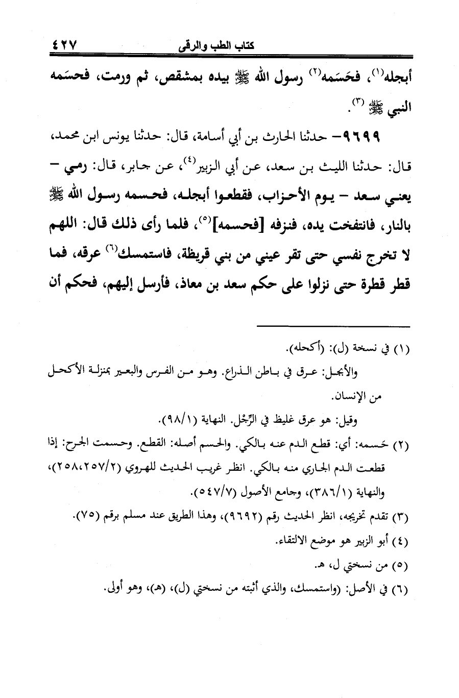 9699 - حدثنا الحارث بن أبي أسامة، قال: حدثنا يونس ابن محمد، قال: حدثنا الليث بن سعد، عن أبي الزبير (¬1)، عن جابر، قال: رمي -يعني سعد- يوم الأحزاب، فقطعوا أبجله، فحسمه رسول الله -صلى الله عليه وسلم- بالنار، فانتفخت يده، فنزفه [فحسمه] (¬2)، فلما رأى ذلك قال: اللهم لا تخرج نفسي حتى تقر عيني من بني قريظة، فاستمسك (¬3) عرقه، فما قطر قطرة حتى نزلوا على حكم سعد بن معاذ، فأرسل إليهم، فحكم أن