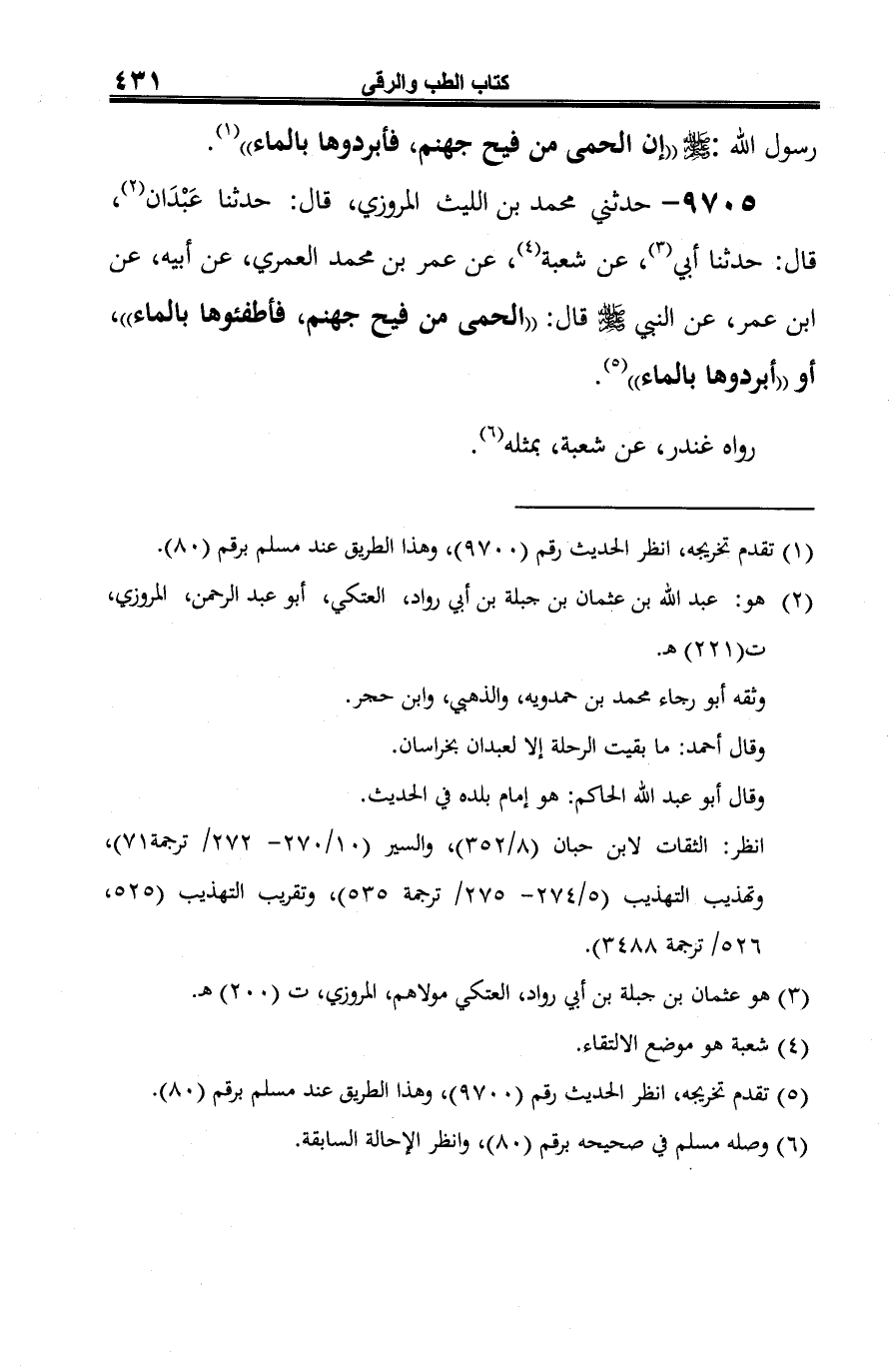 9705 - حدثني محمد بن الليث المروزي، قال: حدثنا عَبْدَان (¬1)، قال: حدثنا أبي (¬2)، عن شعبة (¬3)، عن عمر بن محمد العمري، عن أبيه، عن ابن عمر، عن النبي -صلى الله عليه وسلم- قال: "الحمى من فيح جهنم، فأطفئوها بالماء"، أو "أبردوها بالماء" (¬4).