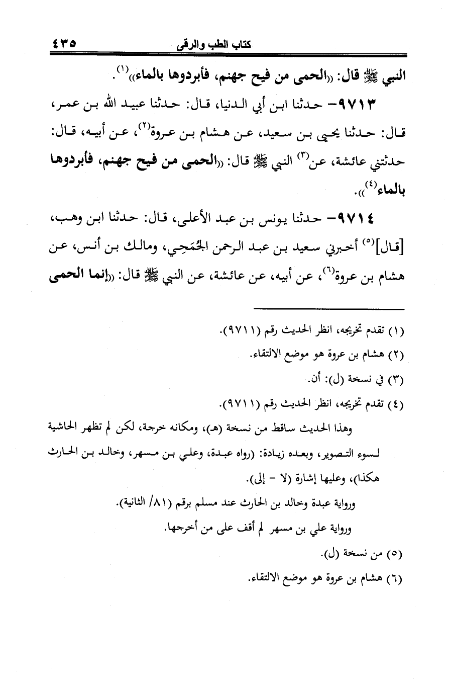 9713 - حدثنا ابن أبي الدنيا، قال: حدثنا عبيد الله بن عمر، قال: حدثنا يحيى بن سعيد، عن هشام بن عروة (¬1)، عن أبيه، قال: حدثتني عائشة، عن (¬2) النبي -صلى الله عليه وسلم- قال: "الحمى من فيح جهنم، فأبردوها بالماء (¬3) ".