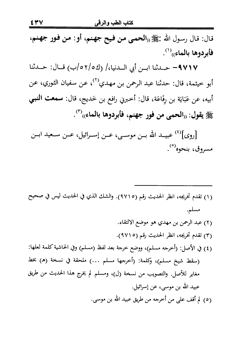 9717 - حدثنا ابن أبي الدنيا، قال: حدثنا أَبو خيثمة، قال: حدثنا عبد الرحمن بن مهدي (¬1)، عن سفيان الثوري، عن أبيه، عن عَبَايَة بن رِفَاعَة، قال: أخبرني رافع بن خَديج، قال: سمعت النبي -صلى الله عليه وسلم- يقول: "الحمى من فور جهنم، فأبردوها بالماء" (¬2).