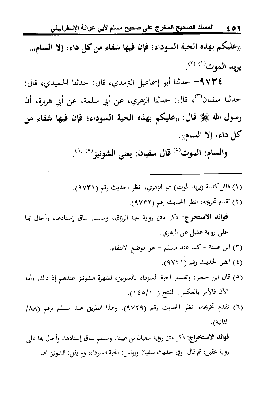 9734 - حدثنا أَبو إسماعيل الترمذي، قال: حدثنا الحميدي، قال: حدثنا سفيان (¬1)، قال: حدثنا الزهري، عن أبي سلمة، عن أبي هريرة، أن رسول الله -صلى الله عليه وسلم- قال: "عليكم بهذه الحبة السوداء، فإن فيها شفاء من كل داء، إلا السام".