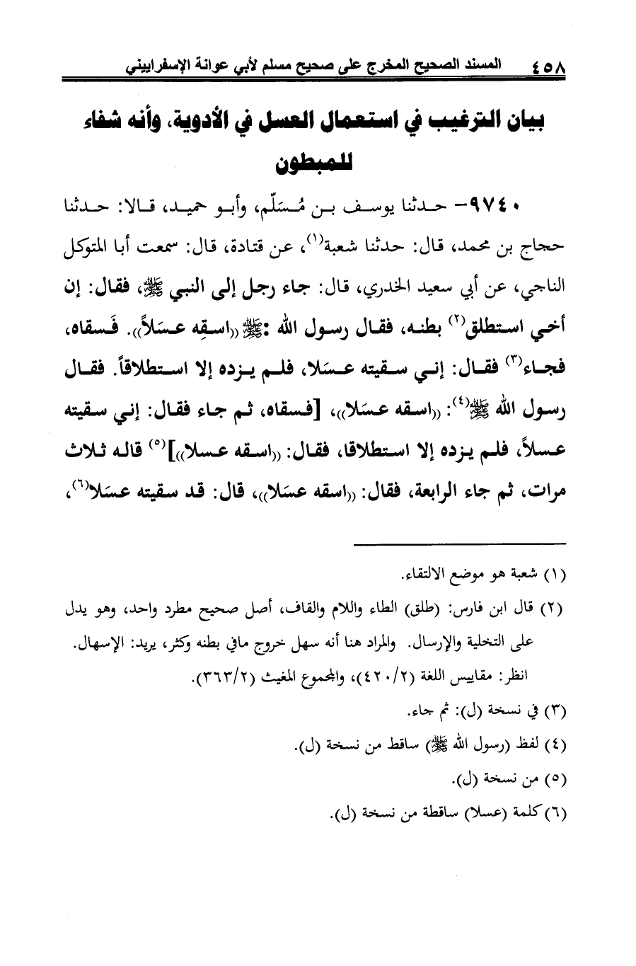 9740 - حدثنا يوسف بن مُسَلّم، وأبو حميد، قالا: حدثنا حجاج بن محمد، قال: حدثنا شعبة (¬1)، عن قتادة، قال: سمعت أبا المتوكل الناجي، عن أبي سعيد الخدري، قال: جاء رجل إلى النبي -صلى الله عليه وسلم-، فقال: إن أخي استطلق (¬2) بطنه، فقال رسول الله: -صلى الله عليه وسلم- "اسقِه عسَلًا". فَسقاه، فجاء (¬3) فقال: إني سقيته عسَلا، فلم يزده إلا استطلاقًا. فقال رسول الله -صلى الله عليه وسلم- (¬4): "اسقه عسَلا"، [فسقاه، ثم جاء فقال: إني سقيته عسلًا، فلم يزده إلا استطلاقا، فقال: "اسقه عسلا"] (¬5) قاله ثلاث مرات، ثم جاء الرابعة، فقال: "اسقه عسَلا"، قال: قد سقيته عسَلا (¬6)،