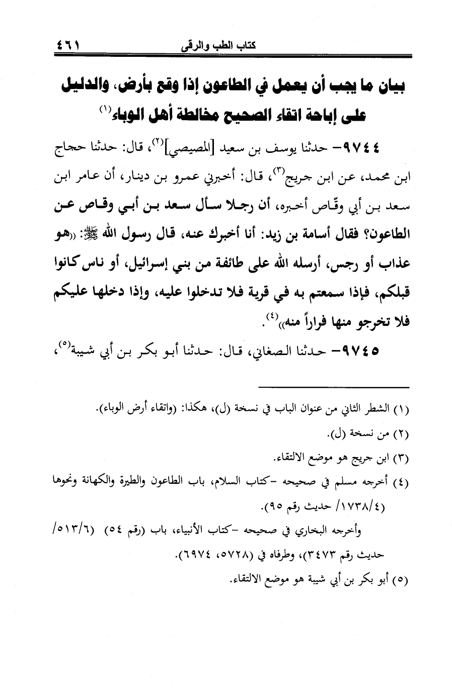 9744 - حدثنا يوسف بن سعيد [المصيصي] (¬1)، قال: حدثنا حجاج ابن محمد، عن ابن جريج (¬2)، قال: أخبرني عمرو بن دينار، أن عامر ابن سعد بن أبي وقّاص أخبره، أن رجلا سأل سعد بن أبي وقاص عن الطاعون؟ فقال أسامة بن زيد: أنا أخبرك عنه، قال رسول الله -صلى الله عليه وسلم-: "هو عذاب أو رجس، أرسله الله على طائفة من بني إسرائيل، أو ناس كانوا قبلكم، فإذا سمعتم به في قرية فلا تدخلوا عليه، وإذا دخلها عليكم فلا تخرجو منها فرارًا منه" (¬3).