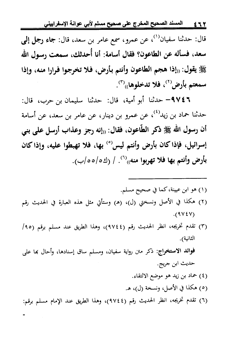 9746 - حدثنا أَبو أمية، قال: حدثنا سليمان بن حرب، قال: حدثنا حماد بن زيد (¬1)، عن عمرو بن دينار، عن عامر بن سعد، عن أسامة أن رسول الله -صلى الله عليه وسلم- ذكر الطّاعون، فقال: "إنه رجز وعذاب أرسل على بني إسرائيل، فإذا كان بأرض وأنتم ليس (¬2) بها، فلا تهبطوا عليه، وإذا كان بأرض وأنتم بها فلا تهربوا منه" (¬3).