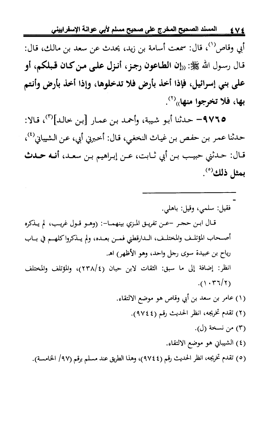 9765 - حدثنا أَبو شيبة، وأحمد بن عمار [بن خالد] (¬1)، قالا: حدثنا عمر بن حفص بن غياث النخعي، قال: أخبرني أَبي، عن الشيباني (¬2)، قال: حدثني حبيب بن أبي ثابت، عن إبراهيم بن سعد، أنه حدث بمثل ذلك (¬3).