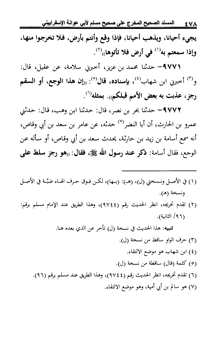 9771 - حدثنا محمد بن عزيز، أخبرني سلامة، عن عقيل، قال: و (¬1) أخبرني ابن شهاب (¬2)، بإسناده، قال (¬3): "إن هذا الوجع، أو السقم رجز، عذبت به بعض الأمم قبلكم". بمثله (¬4).
