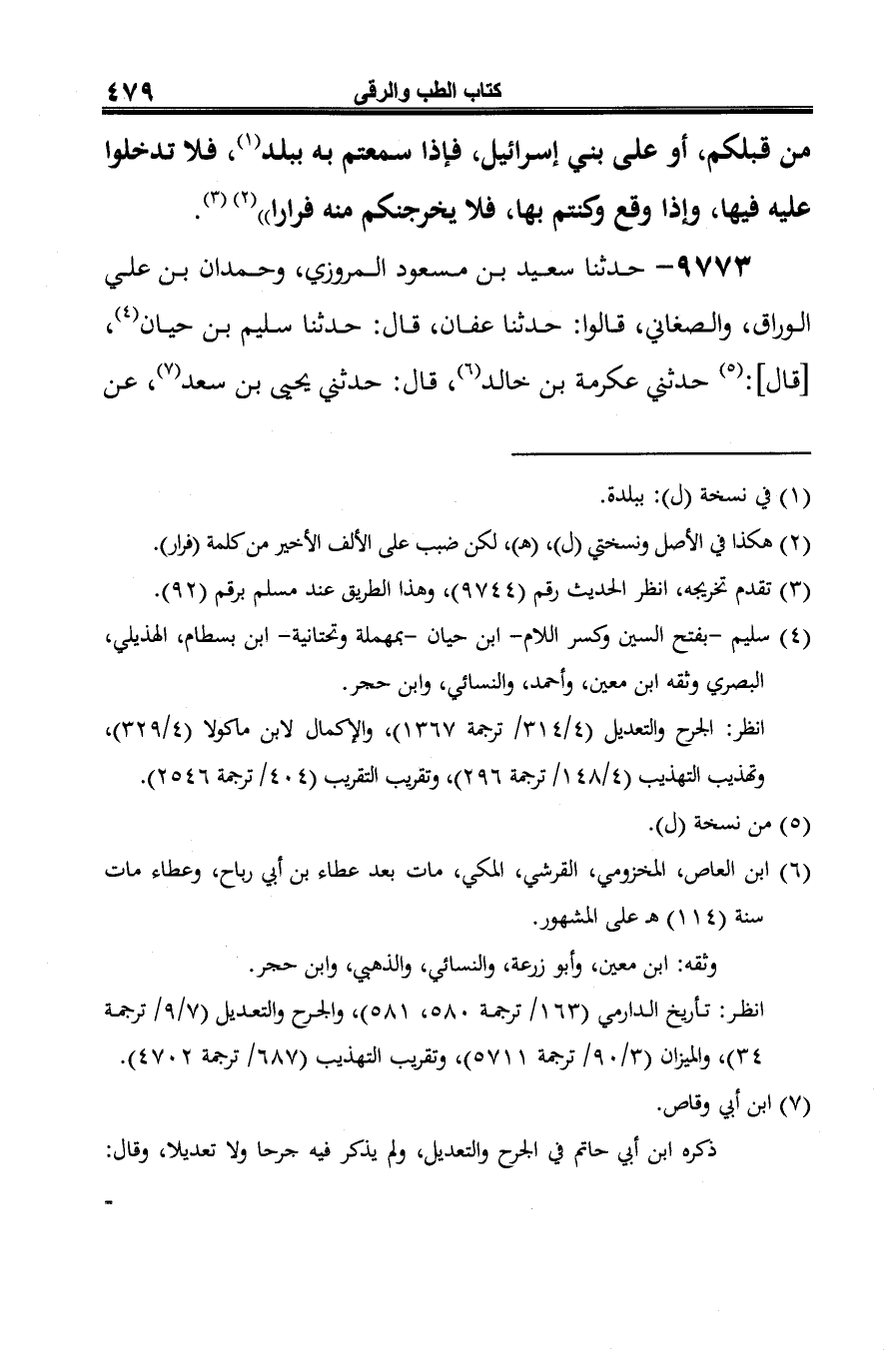 -[480]- أبيه (¬5)، قال: ذكر الطاعون عند رسول الله -صلى الله عليه وسلم- فقال: "رجزٌ أصيب به من كان قبلكم، فإذا كان بأرض، فلا تدخلوها، وإذا كان بها وأنتم بها، فلا تخرجوا منها" (¬6).