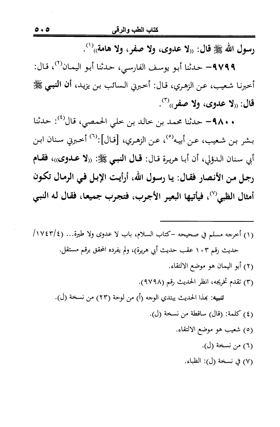 9799 - حدثنا أَبو يوسف الفارسي، حدثنا أَبو اليمان (¬1)، قال: أخبرنا شعيب، عن الزهري، قال: أخبرني السائب بن يزيد، أن النبي -صلى الله عليه وسلم- قال: "لا عدوى، ولا صفر" (¬2).