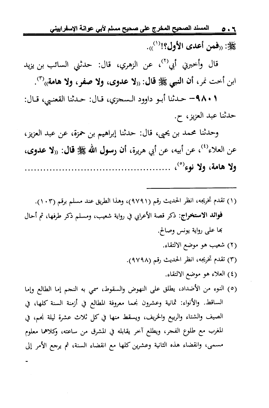 وحدثنا محمد بن يحيى، قال: حدثنا إبراهيم بن حمزة، عن عبد العزيز، عن العلاء (¬1)، عن أبيه، عن أبي هريرة، أن رسول الله -صلى الله عليه وسلم- قال: "لا عدوى، ولا هامة، ولا نوء (¬2)،