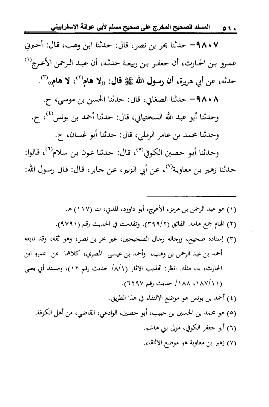 9807 - حدثنا بحر بن نصر، قال: حدثنا ابن وهب، قال: أخبرني عمرو بن الحارث، أن جعفر بن ربيعة حدثه، أن عبد الرحمن الأعرج (¬1) حدثه، عن أبي هريرة، أن رسول الله -صلى الله عليه وسلم- قال: "لا هام (¬2)، لا هام" (¬3).