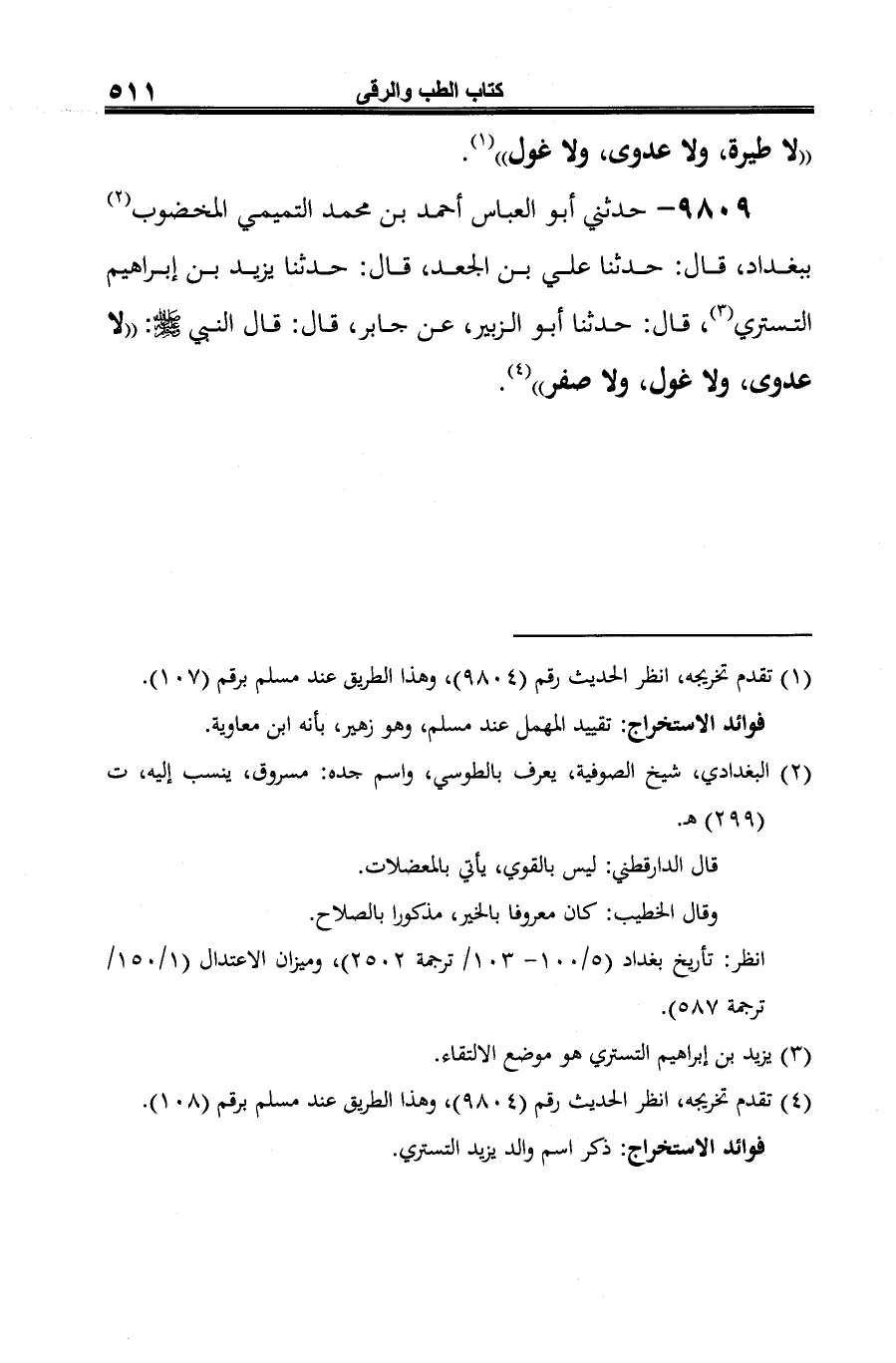 9809 - حدثني أَبو العباس أحمد بن محمد التميمي المخضوب (¬1) ببغداد، قال: حدثنا علي بن الجعد، قال: حدثنا يزيد بن إبراهيم التستري (¬2)، قال: حدثنا أَبو الزبير، عن جابر، قال: قال النبي -صلى الله عليه وسلم-: "لا عدوى، ولا غول، ولا صفر" (¬3).