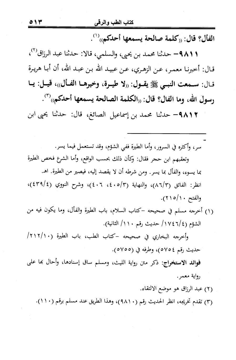 9811 - حدثنا محمد بن يحيى، والسلمي، قالا: حدثنا عبد الرزاق (¬1)، قال: أخبرنا معمر، عن الزهري، عن عبيد الله بن عبد الله، أن أبا هريرة قال: سمعت النبي -صلى الله عليه وسلم- يقول: "لا طيرة، وخيرها الفأل"، قيل: يا رسول الله، وما الفأل؟ قال: "الكلمة الصالحة يسمعها أحدكم" (¬2).