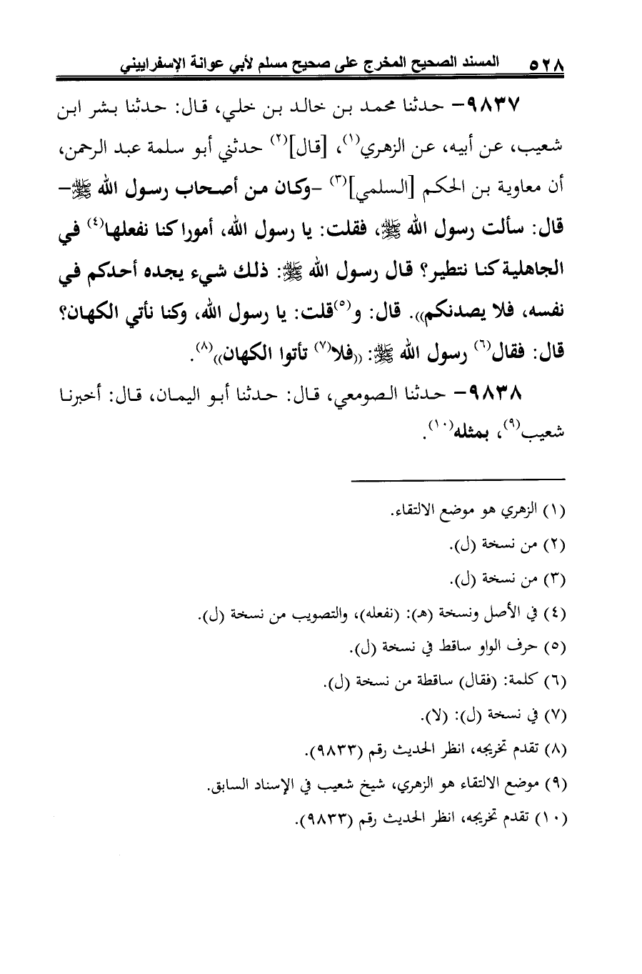 9837 - حدثنا محمد بن خالد بن خلي، قال: حدثنا بشر ابن شعيب، عن أبيه، عن الزهري (¬1)، [قال] (¬2) حدثني أَبو سلمة عبد الرحمن، أن معاوية بن الحكم [السلمي] (¬3) -وكان من أصحاب رسول الله -صلى الله عليه وسلم- قال: سألت رسول الله -صلى الله عليه وسلم-، فقلت: يا رسول الله، أمورا كنا نفعلها (¬4) في الجاهلية كنا نتطير؟ قال رسول الله -صلى الله عليه وسلم-: ذلك شيء يجده أحدكم في نفسه، فلا يصدنكم". قال: و (¬5) قلت: يا رسول الله، وكنا نأتي الكهان؟ قال: فقال (¬6) رسول الله -صلى الله عليه وسلم-: "فلا (¬7) تأتوا الكهان" (¬8).