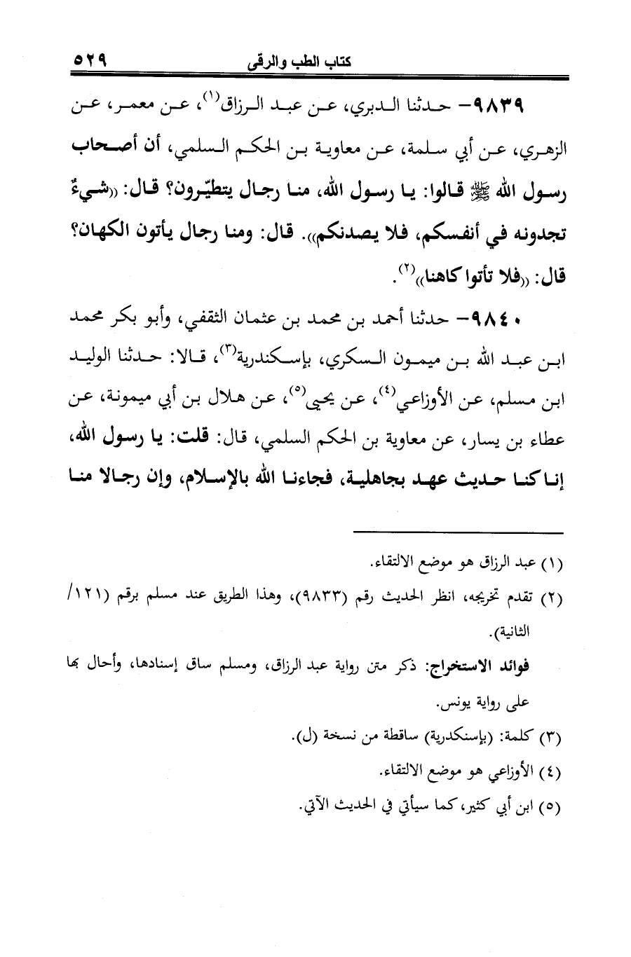 9839 - حدثنا الدبري، عن عبد الرزاق (¬1)، عن معمر، عن الزهري، عن أبي سلمة، عن معاوية بن الحكم السلمي، أن أصحاب رسول الله -صلى الله عليه وسلم- قالوا: يا رسول الله، منا رجال يتطيّرون؟ قال: "شيءٌ تجدونه في أنفسكم، فلا يصدنكم". قال: ومنا رجال يأتون الكهان؟ قال: "فلا تأتوا كاهنا" (¬2).