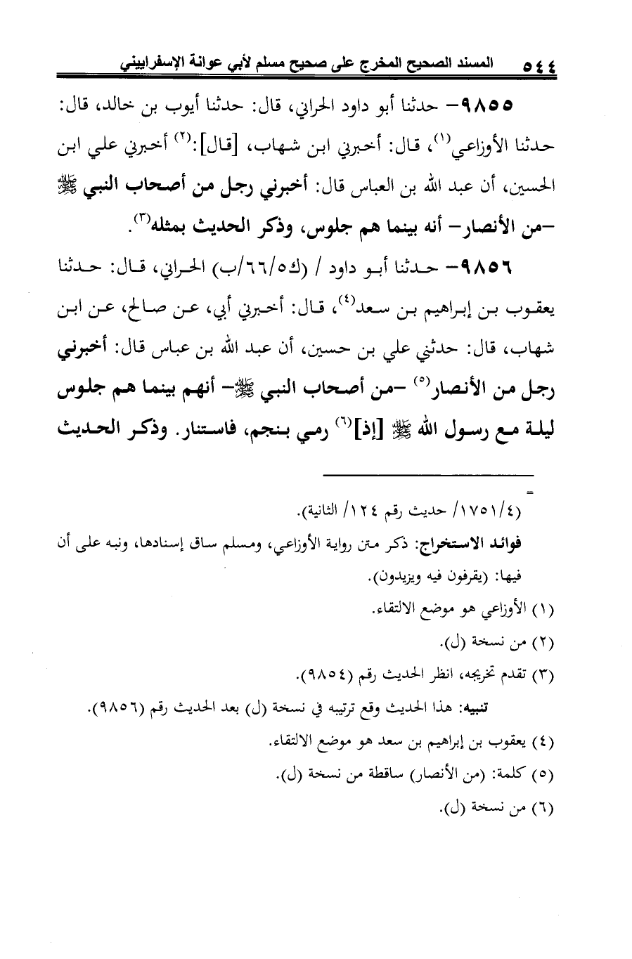 9856 - حدثنا أَبو داود الحراني، قال: حدثنا يعقوب بن إبراهيم بن سعد (¬1)، قال: أخبرني أبي، عن صالح، عن ابن شهاب، قال: حدثني علي بن حسين، أن عبد الله بن عباس قال: أخبرني رجل من الأنصار (¬2) -من أصحاب النبي -صلى الله عليه وسلم- أنهم بينما هم جلوس ليلة مع رسول الله -صلى الله عليه وسلم-[إذ] (¬3) رمي بنجم، فاستنار. وذكر الحديث