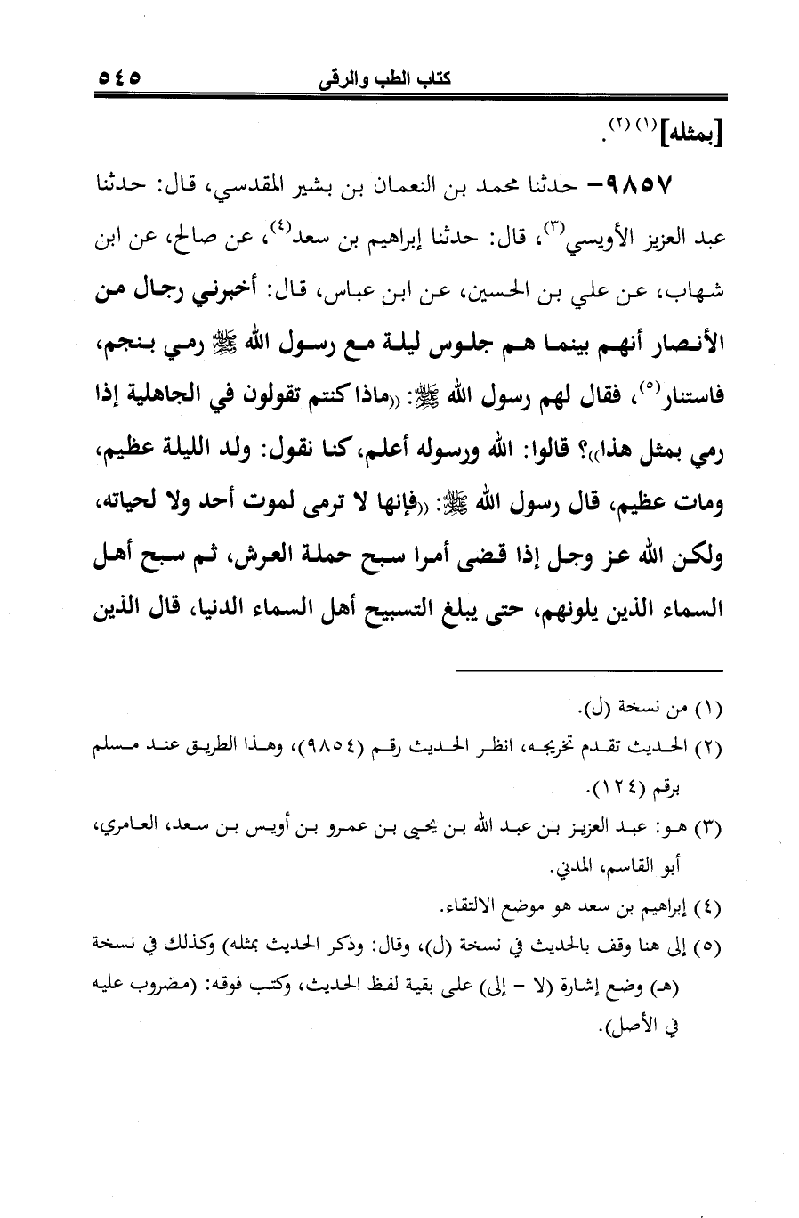 9857 - حدثنا محمد بن النعمان بن بشير المقدسي، قال: حدثنا عبد العزيز الأويسي (¬1)، قال: حدثنا إبراهيم بن سعد (¬2)، عن صالح، عن ابن شهاب، عن علي بن الحسين، عن ابن عباس، قال: أخبرني رجال من الأنصار أنهم بينما هم جلوس ليلة مع رسول الله -صلى الله عليه وسلم- رمي بنجم، فاستنار (¬3)، فقال لهم رسول الله -صلى الله عليه وسلم-: "ماذا كنتم تقولون في الجاهلية إذا رمي بمثل هذا"؟ قالوا: الله ورسوله أعلم، كنا نقول؟ ولد الليلة عظيم، ومات عظيم، قال رسول الله -صلى الله عليه وسلم-: "فإنها لا ترمى لموت أحد ولا لحياته، ولكن الله عز وجل إذا قضى أمرا سبح حملة العرش، ثم سبح أهل السماء الذين يلونهم، حتى يبلغ التسبيح أهل السماء الدنيا، قال الذين