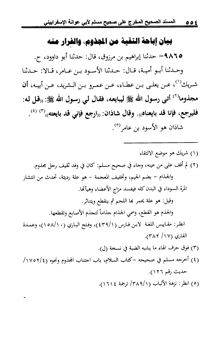 وحدثنا أَبو أمية، قال: حدثنا الأسود بن عامر، قالا: حدثنا شريك (¬1)، عن يعلى بن عطاء، عن عمرو بن الشريد، عن أبيه، أن مجذوما (¬2) أتى رسول الله -صلى الله عليه وسلم- ليبايعه، فقال لي رسول الله -صلى الله عليه وسلم-: "قل له: فليرجع، فإنا قد بايعناه". وقال شاذان: "ارجع فإني قد بايعته" (¬3) (¬4).
