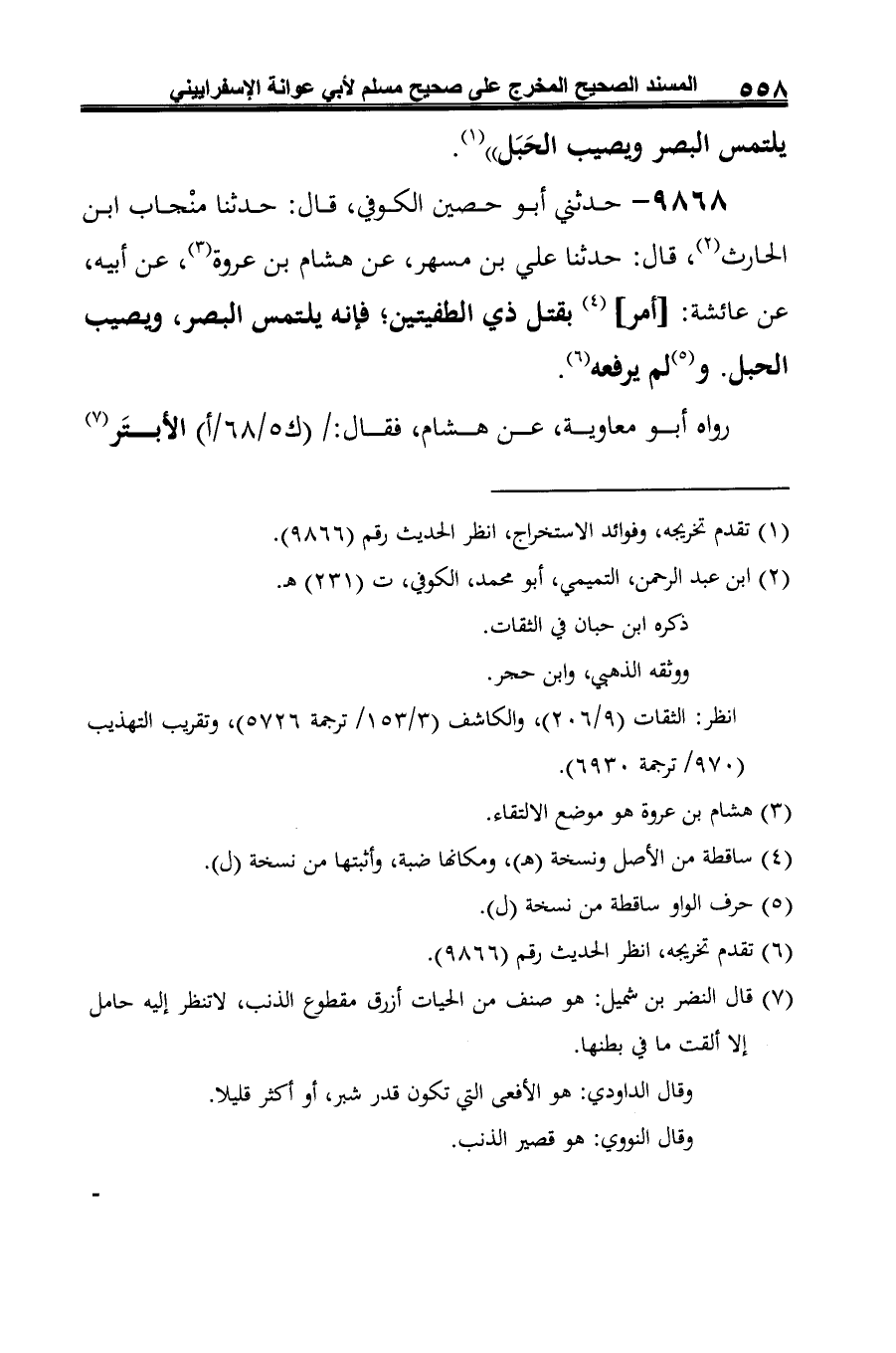 9868 - حدثني أَبو حصين الكوفي، قال: حدثنا منْجاب ابن الحارث (¬1)، قال: حدثنا علي بن مسهر، عن هشام بن عروة (¬2)، عن أبيه، عن عائشة: [أمر] (¬3) بقتل ذي الطفيتين؛ فإنه يلتمس البصر، وبصيب الحبل. و (¬4) لم يرفعه (¬5).