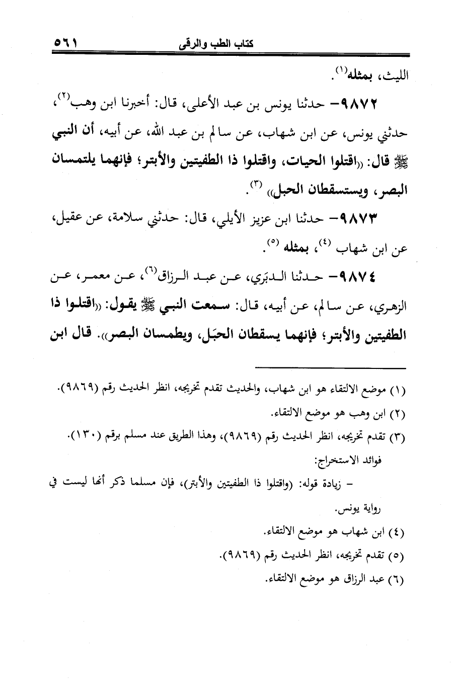 9872 - حدثنا يونس بن عبد الأعلى، قال: أخبرنا ابن وهب (¬1)، حدثني يونس، عن ابن شهاب، عن سالم بن عبد الله، عن أبيه، أن النبي -صلى الله عليه وسلم- قال: "اقتلوا الحيات، واقتلوا ذا الطفيتين والأبتر؛ فإنهما يلتمسان البصر، ويستسقطان الحبل" (¬2).