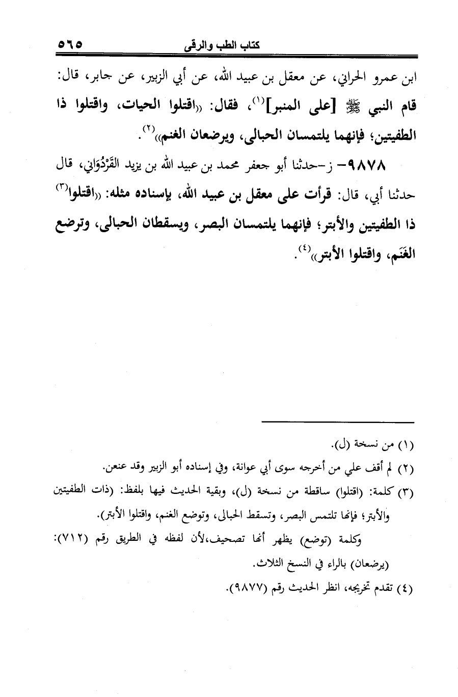 9878 - ز- حدثنا أَبو جعفر محمد بن عبيد الله بن يزيد القَرْدُوَاني، قال حدثنا أبي، قال: قرأت على معقل بن عبيد الله، بإسناده مثله: "اقتلوا (¬1) ذا الطفيتين والأبتر؛ فإنهما يلتمسان البصر، ويسقطان الحبالى، وترضع الغَنَم، واقتلوا الأبتر" (¬2).