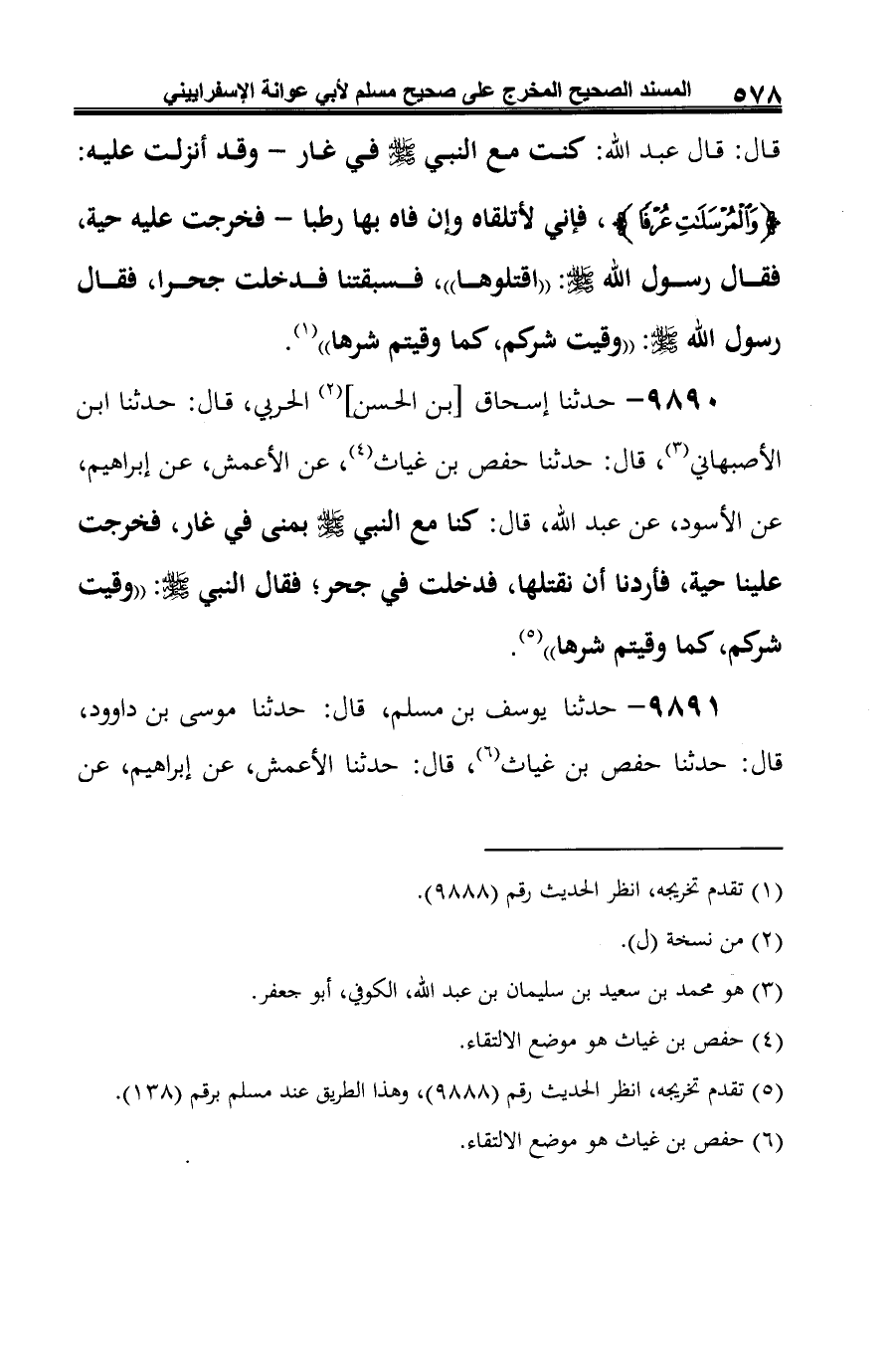 9890 - حدثنا إسحاق [بن الحسن] (¬1) الحربي، قال: حدثنا ابن الأصبهاني (¬2)، قال: حدثنا حفص بن غياث (¬3)، عن الأعمش، عن إبراهيم، عن الأسود، عن عبد الله، قال: كنا مع النبي -صلى الله عليه وسلم- بمنى في غار، فخرجت علينا حية، فأردنا أن نقتلها، فدخلت في جحر؛ فقال النبي -صلى الله عليه وسلم-: "وقيت شركم، كما وقيتم شرها" (¬4).