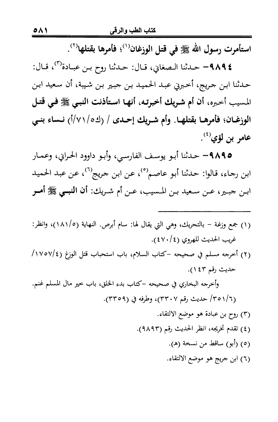 9894 - حدثنا الصغاني، قال: حدثنا روح بن عبادة (¬1)، قال: حدثنا ابن جريج، أخبرني عبد الحميد بن جبير بن شيبة، أن سعيد ابن المسيب أخبره، أن أم شريك أخبرته، أنها استأذنت النبي -صلى الله عليه وسلم- في قتل الوزغان؛ فأمرها بقتلها. وأم شريك إحدى نساء بني عامر بن لؤي (¬2).