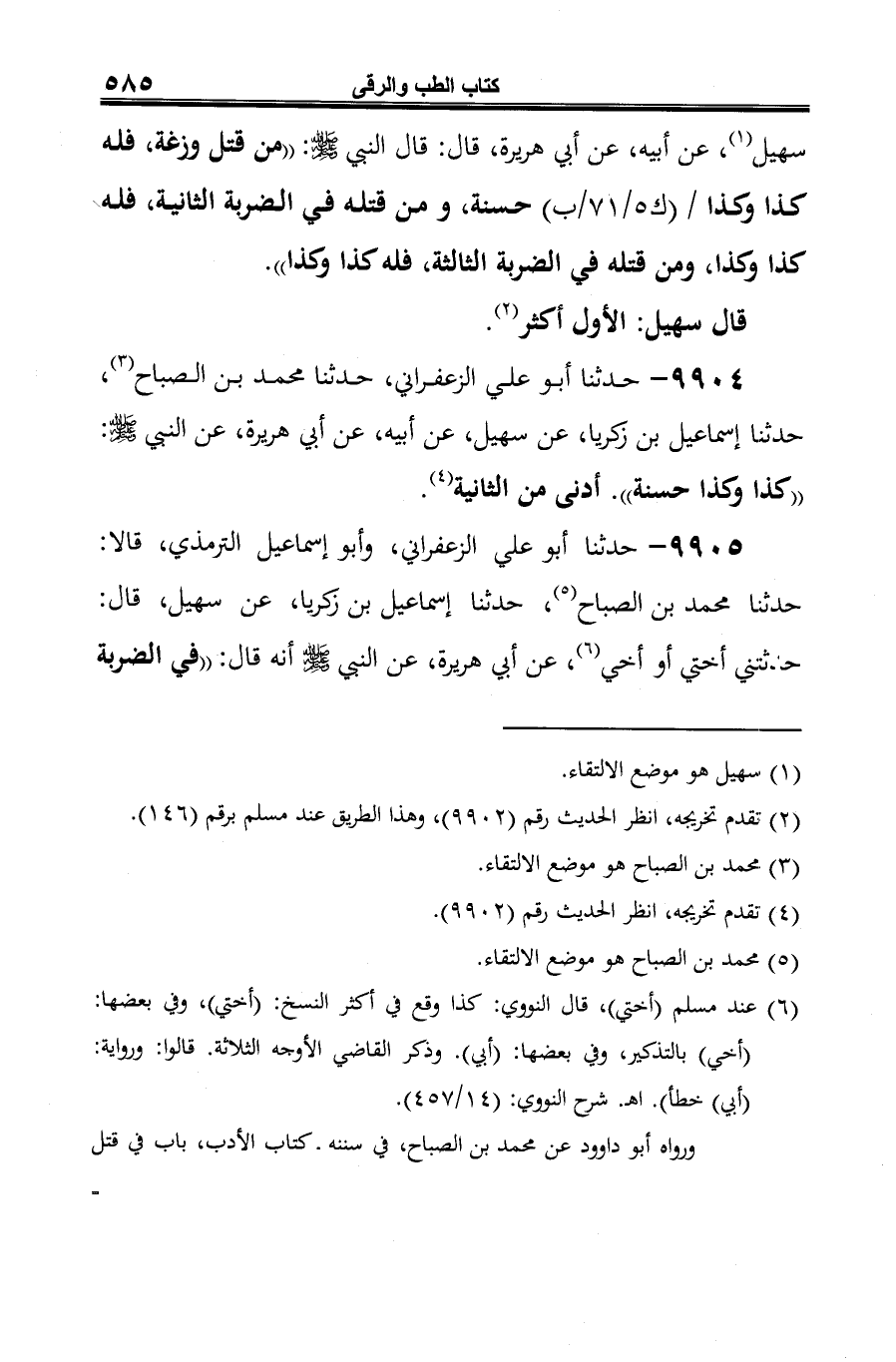 9905 - حدثنا أَبو علي الزعفراني، وأبو إسماعيل الترمذي، قالا: حدثنا، محمد بن الصباح (¬1)، حدثنا إسماعيل بن زكريا، عن سهيل، قال: حدثتني أختي أو أخي (¬2)، عن أبي هريرة، عن النبي -صلى الله عليه وسلم- أنه قال: "في الضربة
