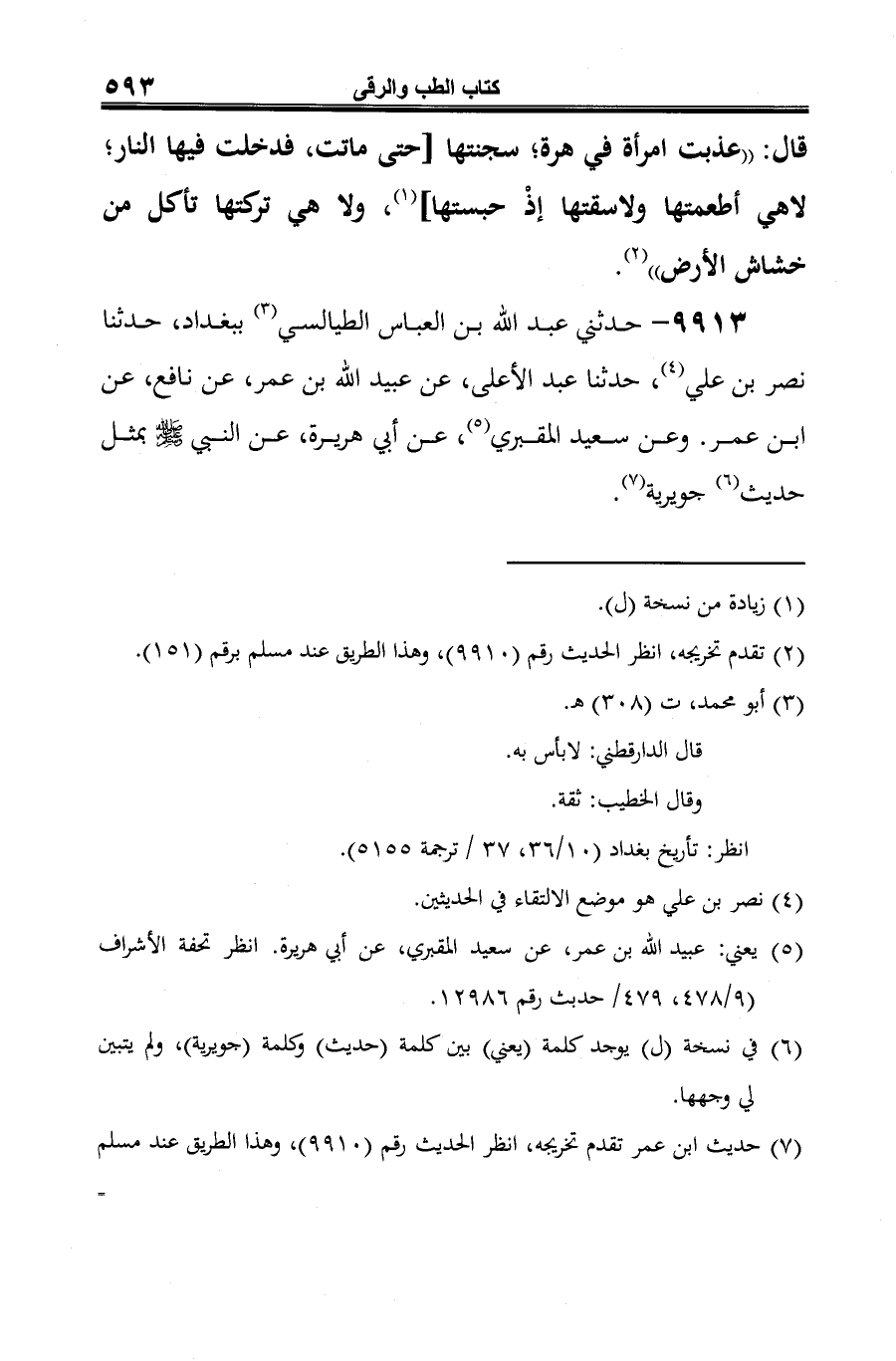 9913 - حدثني عبد الله بن العباس الطيالسي (¬1) ببغداد، حدثنا نصر بن علي (¬2)، حدثنا عبد الأعلى، عن عبيد الله بن عمر، عن نافع، عن ابن عمر. وعن سعيد المقبري (¬3)، عن أبي هريرة، عن النبي -صلى الله عليه وسلم- بمثل حديث (¬4) جويرية (¬5).