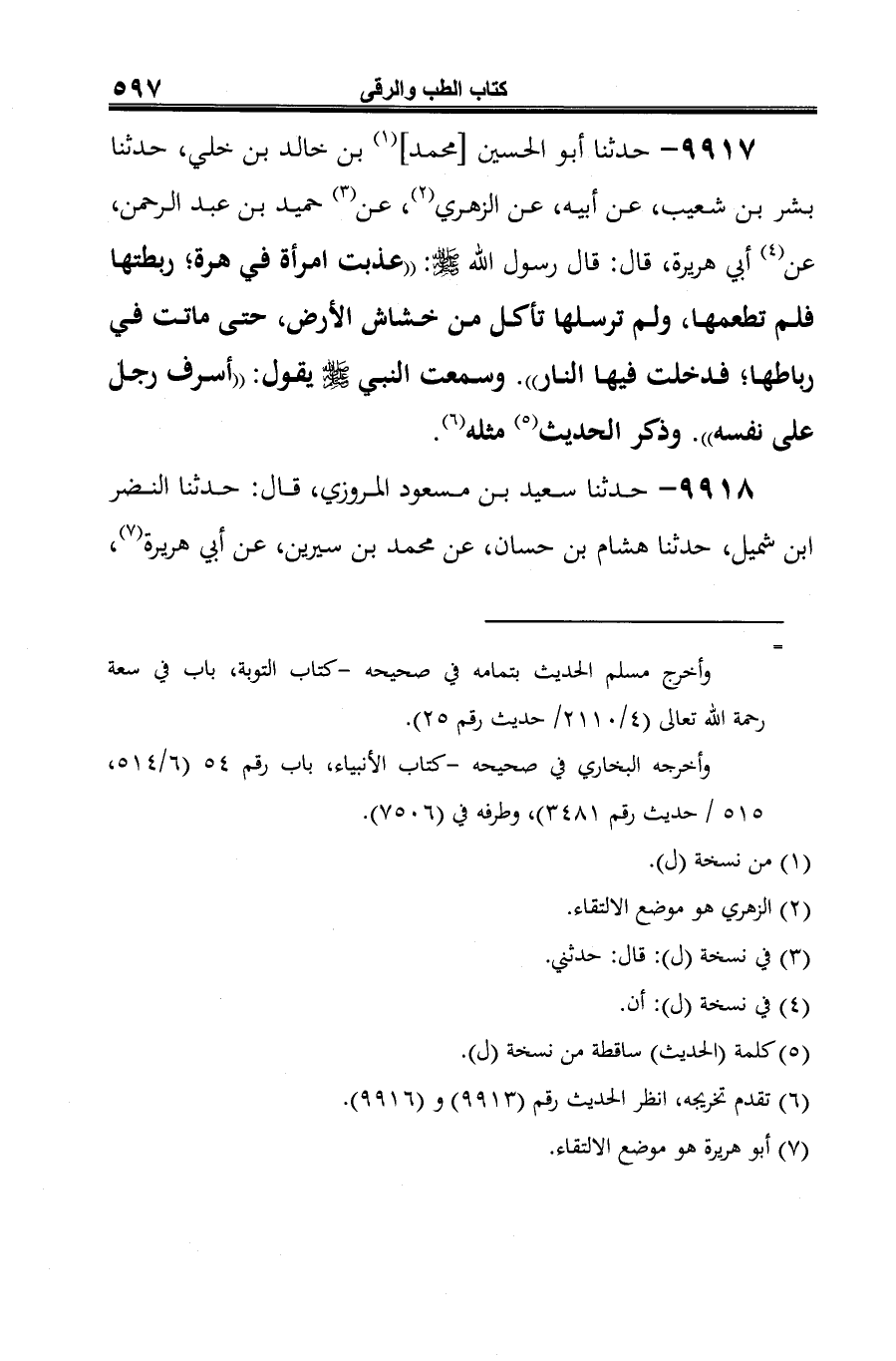 9917 - حدثنا أَبو الحسين [محمد] (¬1) بن خالد بن خلي، حدثنا بشر بن شعيب، عن أبيه، عن الزهري (¬2)، عن (¬3) حميد بن عبد الرحمن، عن (¬4) أبي هريرة، قال: قال رسول الله -صلى الله عليه وسلم-: "عذبت امرأة في هرة؛ ربطتها فلم تطعمها، ولم ترسلها تأكل من خشاش الأرض، حتى ماتت في رباطها؛ فدخلت فيها النار". وسمعت النبي -صلى الله عليه وسلم- يقول: "أسرف رجل على نفسه". وذكر الحديث (¬5) مثله (¬6).