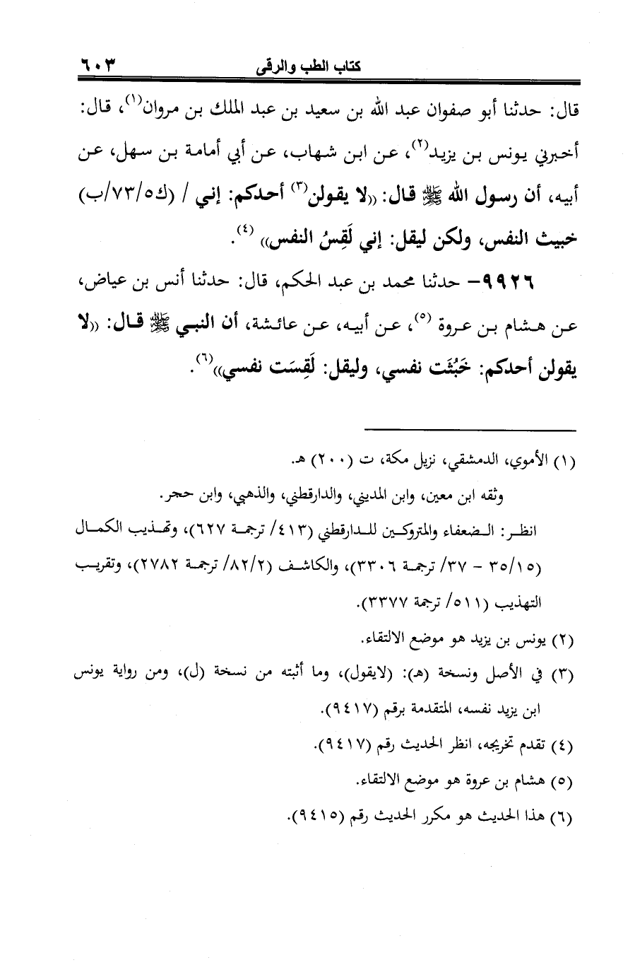 9926 - حدثنا محمد بن عبد الحكم، قال: حدثنا أنس بن عياض، عن هشام بن عروة (¬1)، عن أبيه، عن عائشة، أن النبي -صلى الله عليه وسلم- قال: "لا يقولن أحدكم: خَبُثَت نفسي، وليقل: لَقِسَت نفسي" (¬2).