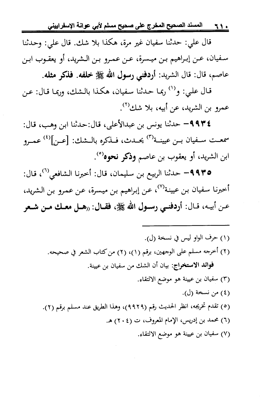 9935 - حدثنا الربيع بن سليمان، قال: أخبرنا الشافعي (¬1)، قال: أخبرنا سفيان بن عيينة (¬2)، عن إبراهيم بن ميسرة، عن عمرو بن الشريد، عن أبيه، قال: أردفني رسول الله -صلى الله عليه وسلم-، فقال: "هل معك من شعر