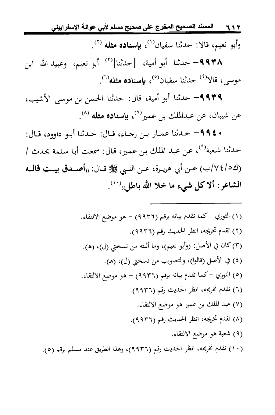 9940 - حدثنا عمار بن رجاء، قال: حدثنا أَبو داوود، قال: حدثنا شعبة (¬1)، عن عبد الملك بن عمير، قال: سمعت أبا سلمة يحدث عن أبي هريرة، عن النبي -صلى الله عليه وسلم- قال: "أصدق بيت قاله الشاعر: ألا كل شيء ما خلا الله باطل" (¬2).